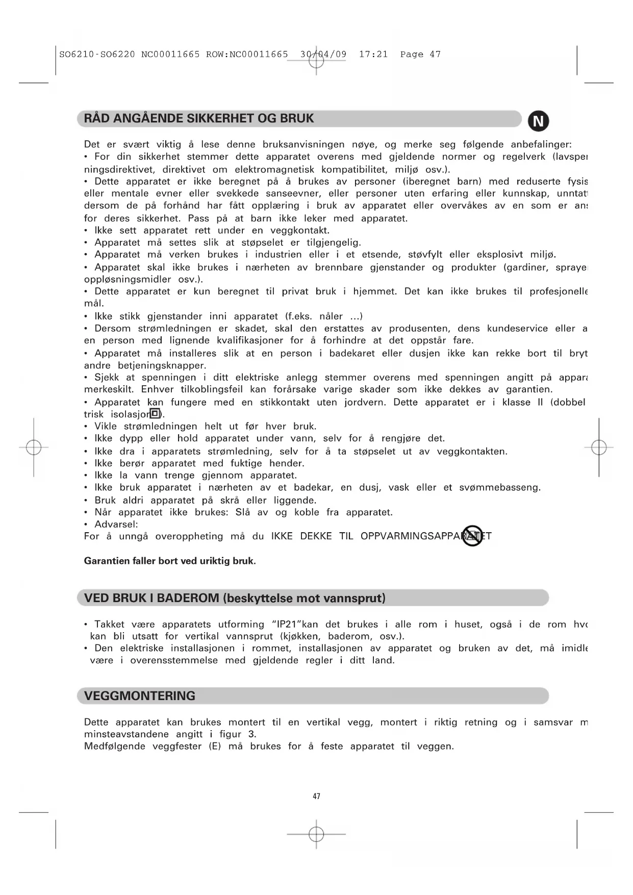 - Advarsel: For å unngå overoppheting må du IKKE DEKKE TIL OPPVARMINGSAPPARATET Garantien faller bort ved uriktig bruk. VED BRUK I BADEROM (beskyttelse mot vannsprut)