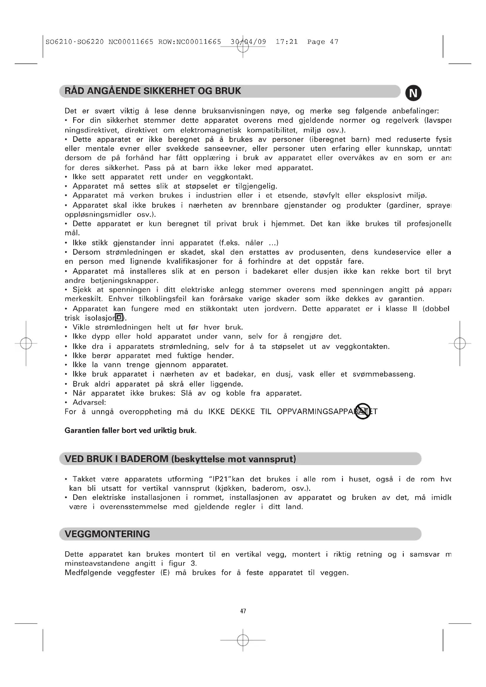 - Advarsel: For å unngå overoppheting må du IKKE DEKKE TIL OPPVARMINGSAPPARATET Garantien faller bort ved uriktig bruk. VED BRUK I BADEROM (beskyttelse mot vannsprut)