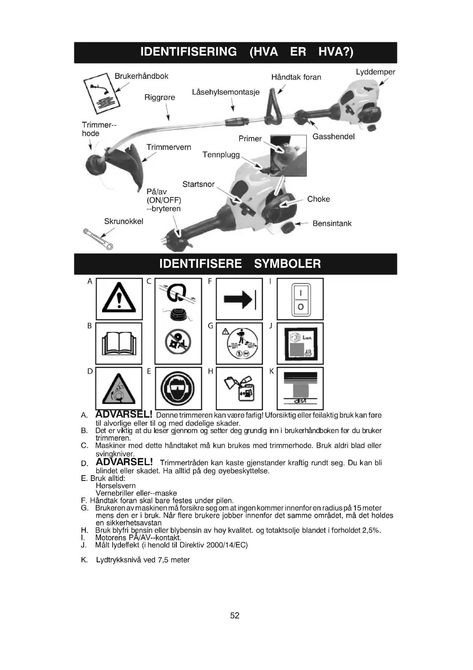 ADVARSEL! Trimmertråden kan kaste gjenstander kraftig rundt seg. Du kan bli blindet eller skadet. Ha alltid på deg øyebeskyttelse. E. Bruk alltid: Hørselsvern Vernebriller eller--maske F. Håndtak foran skal bare festes under pilen. G. Brukerenav maskinen må forsikre seg om at ingenkommer innenfor en radius på 15 meter mens den er i bruk. Når flere brukere jobber innenfor det samme området, må det holdes en sikkerhetsavstan H. Bruk blyfri bensin eller blybensin av høy kvalitet. og totaktsolje blandet i forholdet 2,5%.