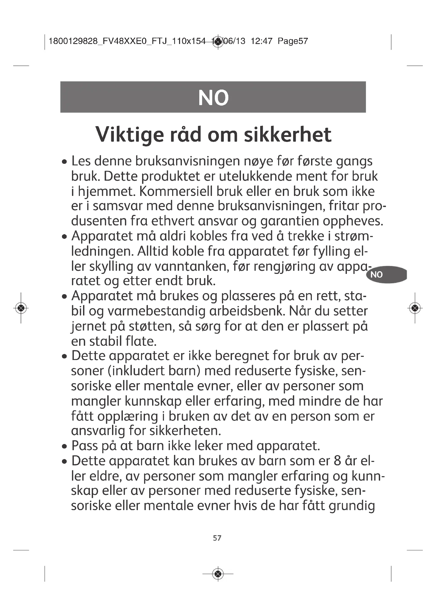 - Dette apparatet kan brukes av barn som er 8 år el- ler eldre, av personer som mangler erfaring og kunn- skap eller av personer med reduserte fysiske, sen- soriske eller mentale evner hvis de har fått grundig 1800129828_FV48XXE0_FTJ_110x154 18/06/13 12:47 Page5758 opplæring i bruken av apparatet, er under oppsyn og forstår farene ved det. Barn må ikke leke med ap- paratet. Rengjøring og alminnelig vedlikehold skal ikke utføres av barn med mindre de er 8 år eller el- dre og under oppsyn. Apparatet og strømledningen må holdes utenfor rek- kevidde for barn yngre enn 8 år.