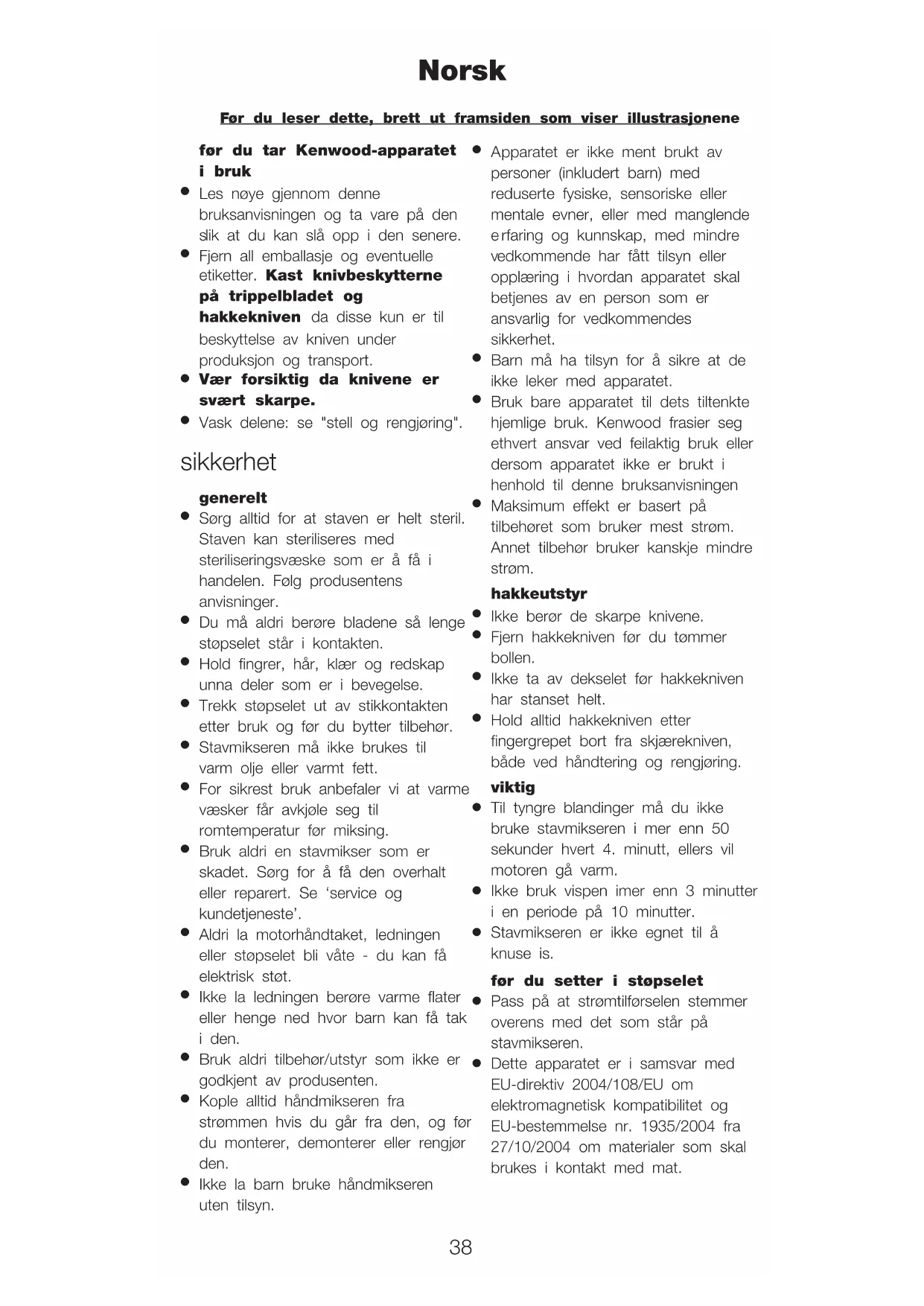 Bruk bare apparatet til dets tiltenkte hjemlige bruk. Kenwood frasier seg ethvert ansvar ved feilaktig bruk eller dersom apparatet ikke er brukt i henhold til denne bruksanvisningen
