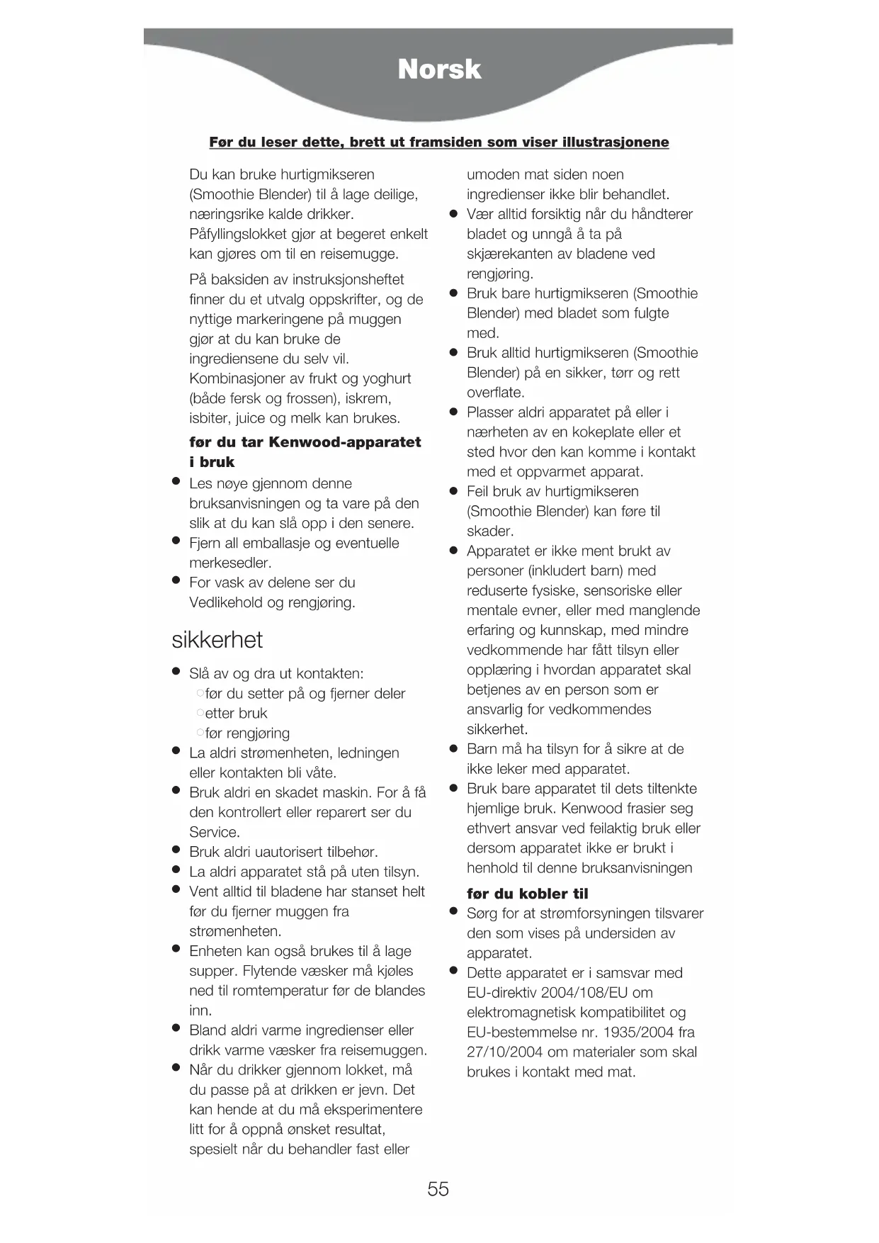Bruk bare apparatet til dets tiltenkte hjemlige bruk. Kenwood frasier seg ethvert ansvar ved feilaktig bruk eller dersom apparatet ikke er brukt i henhold til denne bruksanvisningen før du kobler til