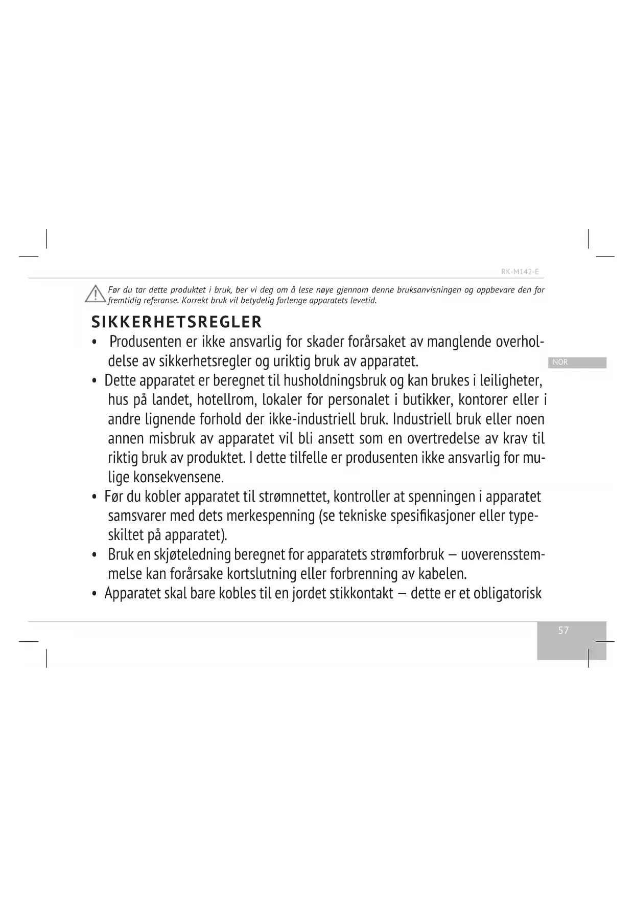 Dette produktet er garantert for en periode på 2 år fra kjøpsdato. I garantitiden er produsenten ansvarlig for eliminering av alle mulige fabrikkfeil som skyldes dårlig kvalitet på materialer og utførelse med hjelp av reparasjon, erstatning av deler eller hele produktet. Garantien skal være gyldig bare dersom kjøpsdato er bekreftet med stempel og underskrift av selger på et spesielt garantikort. Garantien er gyldig kun hvis produktet ble brukt i henhold til bruksanvisningen, ikke ble reparert, demontert eller skadet på grunn av misbruk, samt produktets komplett sett er bevart. Garantien gjelder ikke normal slitasje på produktet og forbruksmaterialer (ltre, lyspærer, non-slipp belegg, tetninger osv.). Produktets levetid og garantitiden beregnes fra datoen for salg eller fra produksjonsdato (hvis salgstidspunktet ikke kan bli identisert). Produksjonsdato av apparatet kan bli funnet i serienummeret som står på identikasjonsetiketten på apparatets utvendig side. Serienummeret består av tretten tegn. Den sekste og den syvende tegn betyr måned og den åttende betyr år av apparatets produksjon. Produktets levetid fastsatt av produsenten er 3 år fra kjøpsdato. Denne levetiden er gyldig forutsatt at apparatets drift er i henhold til denne bruksanvisningen og tekniske krav er oppfylt. Miljøvennlig utnytting (utnytting av elektrisk og elektronisk utstyr) Emballasjen, bruksanvisningen og selve apparatet skal tas med til egnet innsamlingssted for resirkulering av elektrisk og elektronisk utstyr. For å hjelpe til å ta vare på miljøet, ikke kast elektronisk avfall hvor som helst. Brukt (gammelt) utstyr bør ikke kastes sammen med vanlig hushold- ningsavfall, det skal behandles separat. Eiere av gammelt utstyr må bringe ut- styret til spesielle innsamlingspunkter eller til relevante organisasjoner. Således hjelper de programmet for gjenvinning av verdifull råstoff, så vel som rengjøring av forurensningsstoffer. Dette apparatet er merket i overensstemmelse med EU-direktiv 2012/19/EU – vedrørende brukte elektriske og elektroniske apparater. Retningslinjene setter et rammeverk for returnering og resirkulering av brukte apparater i hele EU.63 SWE RK-M142-E Innan du börjar använda denna apparat, bör du läsa igenom denna bruksanvisning noggrant och förvara den som hand- boken. Använder du apparaten på ett rätt sätt ska den vara i bruk på lång tid.