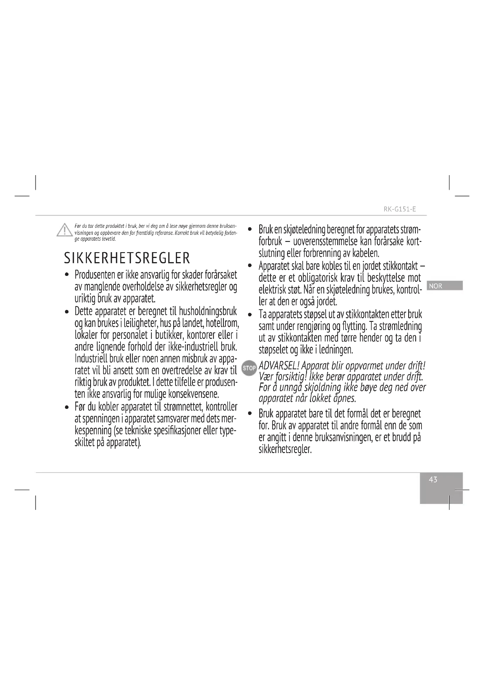 Ta apparatets støpsel ut av stikkontakten etter bruk samt under rengjøring og ytting. Ta strømledning ut av stikkontakten med tørre hender og ta den i støpselet og ikke i ledningen. ADVARSEL! Apparat blir oppvarmet under drift! Vær forsiktig! Ikke berør apparatet under drift. For å unngå skjoldning ikke bøye deg ned over apparatet når lokket åpnes.