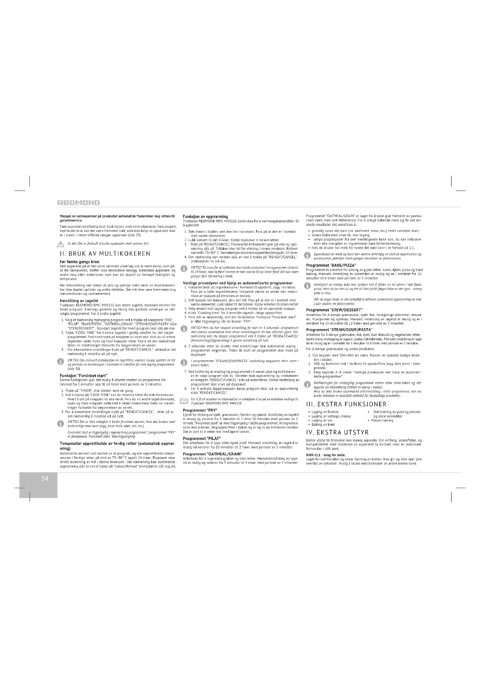 Pakk ut produktet forsiktig og ta det ut av boksen, fjern alt innpakkingsma- terialet og reklame stikker med unntak av merkelapp med serienummer.54 Funksjon av oppvarming Trykkoker REDMOND RMC-M4515E kanbrukes for å varmeoppkalderetter. Or å gjøredet: