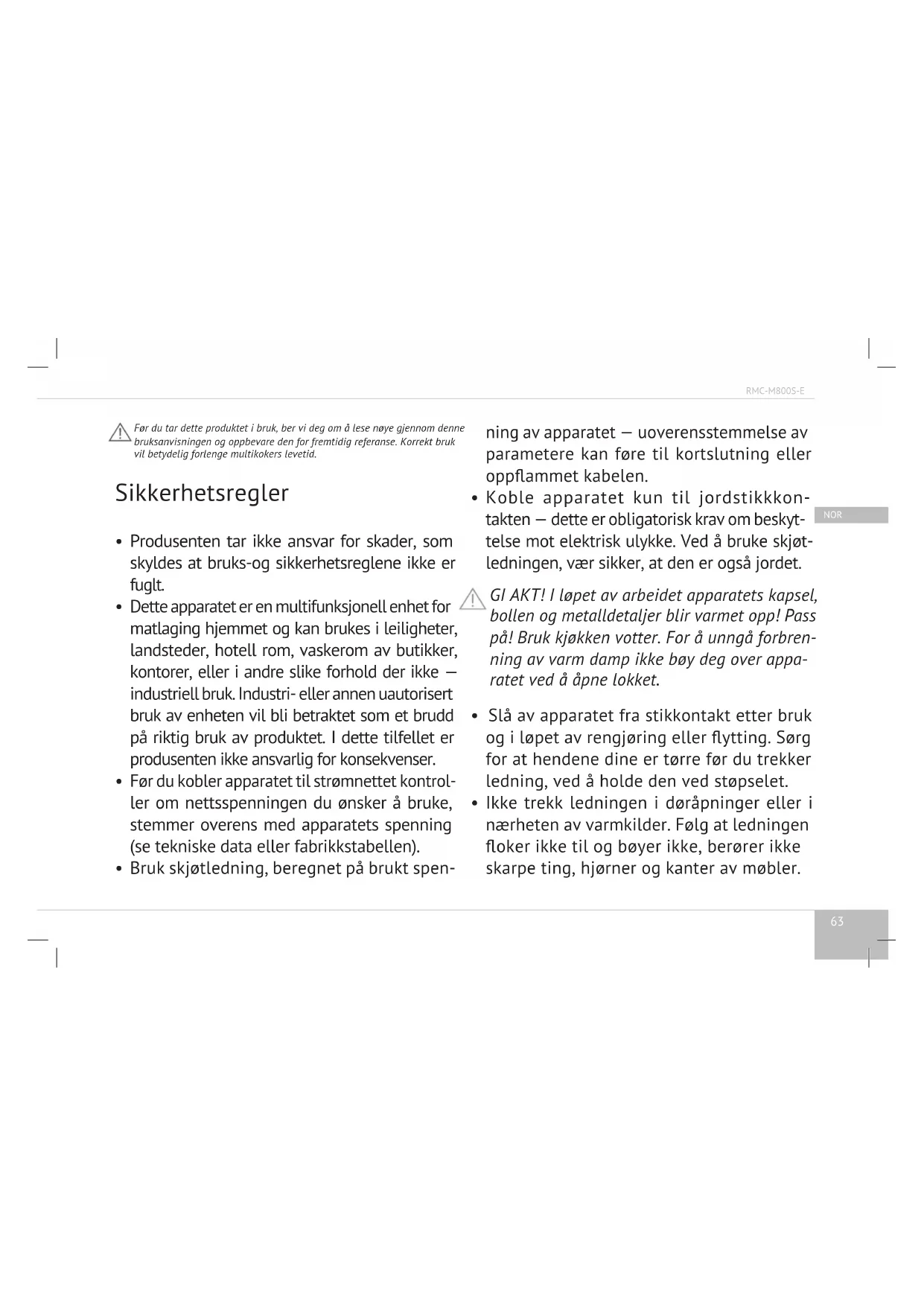 Koble apparatet kun til jordstikkkon- takten — dette er obligatorisk krav om beskyt- telse mot elektrisk ulykke. Ved å bruke skjøt- ledningen, vær sikker, at den er også jordet. GI AKT! I løpet av arbeidet apparatets kapsel, bollen og metalldetaljer blir varmet opp! Pass på! Bruk kjøkken votter. For å unngå forbren- ning av varm damp ikke bøy deg over appa- ratet ved å åpne lokket.