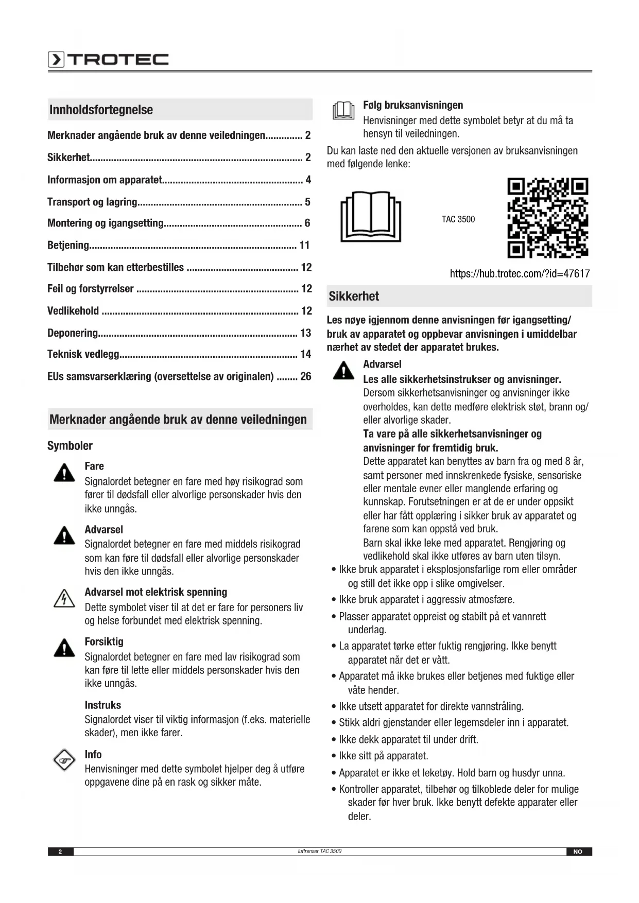 - EUs samsvarserklæring (oversettelse av originalen) Merknader angående bruk av denne veiledningen Symboler Fare Signalordet betegner en fare med høy risikograd som fører til dødsfall eller alvorlige personskader hvis den ikke unngås. Advarsel Signalordet betegner en fare med middels risikograd som kan føre til dødsfall eller alvorlige personskader hvis den ikke unngås. Advarsel mot elektrisk spenning Dette symbolet viser til at det er fare for personers liv og helse forbundet med elektrisk spenning. Forsiktig Signalordet betegner en fare med lav risikograd som kan føre til lette eller middels personskader hvis den ikke unngås. Instruks Signalordet viser til viktig informasjon (f.eks. materielle skader), men ikke farer. Info Henvisninger med dette symbolet hjelper deg å utføre oppgavene dine på en rask og sikker måte. Følg bruksanvisningen Henvisninger med dette symbolet betyr at du må ta hensyn til veiledningen. Du kan laste ned den aktuelle versjonen av bruksanvisningen med følgende lenke: TAC 3500 https://hub.trotec.com/?id=47617 Sikkerhet Les nøye igjennom denne anvisningen før igangsetting/ bruk av apparatet og oppbevar anvisningen i umiddelbar nærhet av stedet der apparatet brukes. Advarsel Les alle sikkerhetsinstrukser og anvisninger. Dersom sikkerhetsanvisninger og anvisninger ikke overholdes, kan dette medføre elektrisk støt, brann og/ eller alvorlige skader. Ta vare på alle sikkerhetsanvisninger og anvisninger for fremtidig bruk. Dette apparatet kan benyttes av barn fra og med 8 år, samt personer med innskrenkede fysiske, sensoriske eller mentale evner eller manglende erfaring og kunnskap. Forutsetningen er at de er under oppsikt eller har fått opplæring i sikker bruk av apparatet og farene som kan oppstå ved bruk. Barn skal ikke leke med apparatet. Rengjøring og vedlikehold skal ikke utføres av barn uten tilsyn. p. 26
