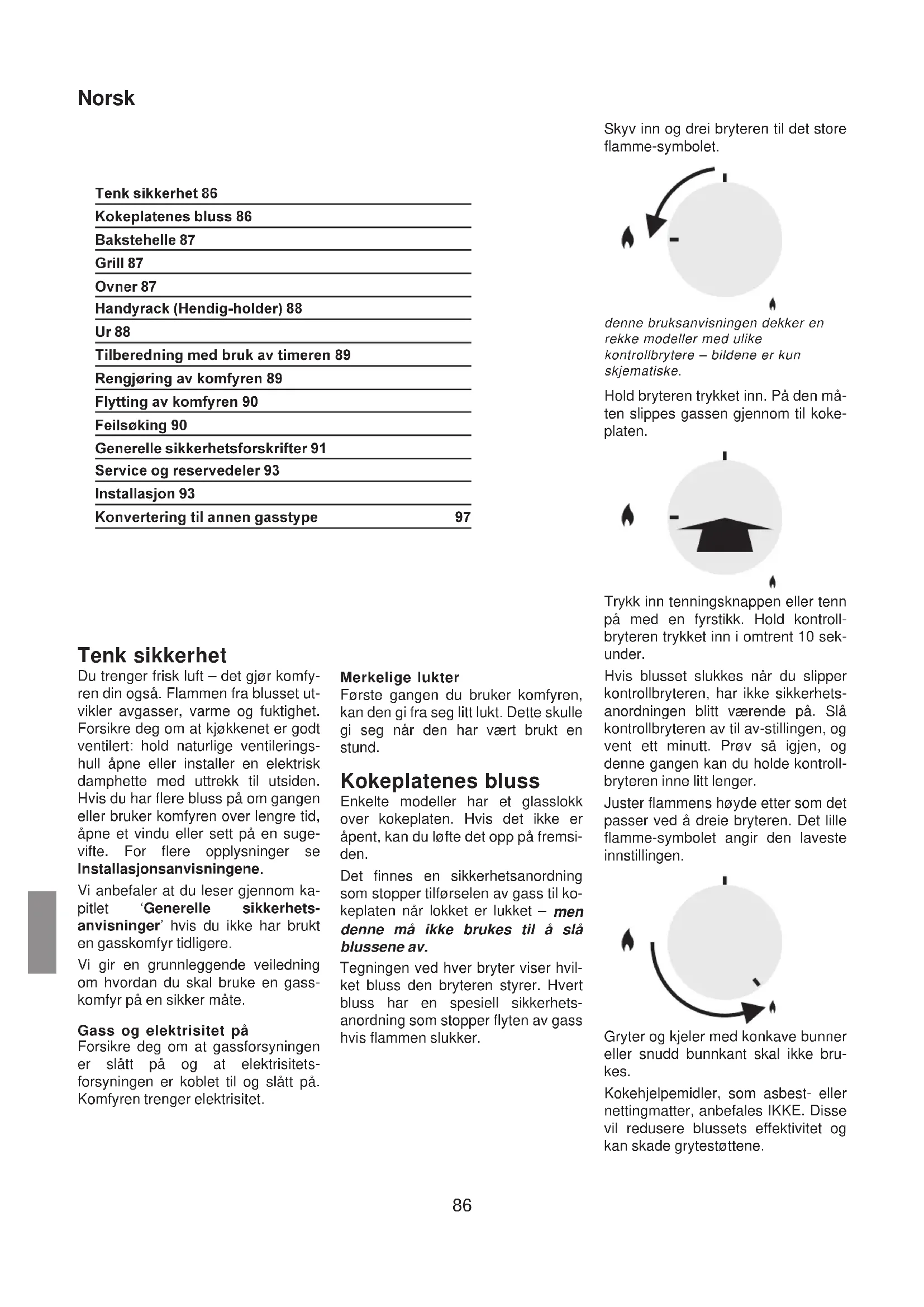 Tenk sikkerhet 86 Kokeplatenes bluss 86 Bakstehelle 87 Grill 87 Ovner 87 Handyrack (Hendig-holder) 88 Ur 88 Tilberedning med bruk av timeren 89 Rengjøring av komfyren 89 Flytting av komfyren 90 Feilsøking 90 Generelle sikkerhetsforskrifter 91 Service og reservedeler 93 Installasjon 93 Konvertering til annen gasstype 97 Tenk sikkerhet Du trenger frisk luft – det gjør komfy- ren din også. Flammen fra blusset ut- vikler avgasser, varme og fuktighet. Forsikre deg om at kjøkkenet er godt ventilert: hold naturlige ventilerings- hull åpne eller installer en elektrisk damphette med uttrekk til utsiden. Hvis du har flere bluss på om gangen eller bruker komfyren over lengre tid, åpne et vindu eller sett på en suge- vifte. For flere opplysninger se Installasjonsanvisningene. Vi anbefaler at du leser gjennom ka- pitlet ‘Generelle sikkerhets- anvisninger’ hvis du ikke har brukt en gasskomfyr tidligere. Vi gir en grunnleggende veiledning om hvordan du skal bruke en gass- komfyr på en sikker måte. Gass og elektrisitet på Forsikre deg om at gassforsyningen er slått på og at elektrisitets- forsyningen er koblet til og slått på. Komfyren trenger elektrisitet. Skyv inn og drei bryteren til det store flamme-symbolet. denne bruksanvisningen dekker en rekke modeller med ulike kontrollbrytere – bildene er kun skjematiske. Hold bryteren trykket inn. På den må- ten slippes gassen gjennom til koke- platen. Trykk inn tenningsknappen eller tenn på med en fyrstikk. Hold kontroll- bryteren trykket inn i omtrent 10 sek- under. Hvis blusset slukkes når du slipper kontrollbryteren, har ikke sikkerhets- anordningen blitt værende på. Slå kontrollbryteren av til av-stillingen, og vent ett minutt. Prøv så igjen, og denne gangen kan du holde kontroll- bryteren inne litt lenger. Juster flammens høyde etter som det passer ved å dreie bryteren. Det lille flamme-symbolet angir den laveste innstillingen. Gryter og kjeler med konkave bunner eller snudd bunnkant skal ikke bru- kes. Kokehjelpemidler, som asbest- eller nettingmatter, anbefales IKKE. Disse vil redusere blussets effektivitet og kan skade grytestøttene. Merkelige lukter Første gangen du bruker komfyren, kan den gi fra seg litt lukt. Dette skulle gi seg når den har vært brukt en stund. Kokeplatenes bluss Enkelte modeller har et glasslokk over kokeplaten. Hvis det ikke er åpent, kan du løfte det opp på fremsi- den. Det finnes en sikkerhetsanordning som stopper tilførselen av gass til ko- keplaten når lokket er lukket – men denne må ikke brukes til å slå blussene av. Tegningen ved hver bryter viser hvil- ket bluss den bryteren styrer. Hvert bluss har en spesiell sikkerhets- anordning som stopper flyten av gass hvis flammen slukker.Norsk