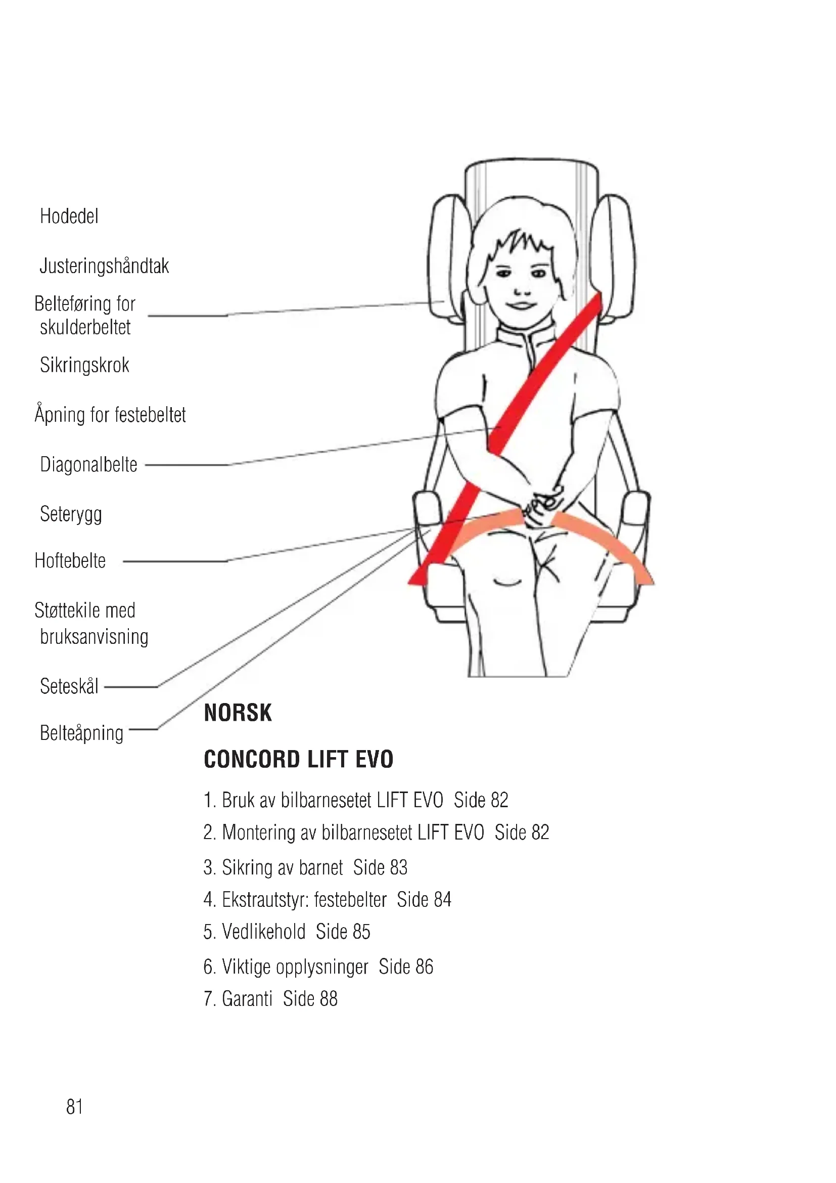 Hodedel Justeringshåndtak Belteføring for skulderbeltet Sikringskrok Åpning for festebeltet Diagonalbelte Seterygg Hoftebelte Støttekile med bruksanvisning Seteskål Belteåpning82