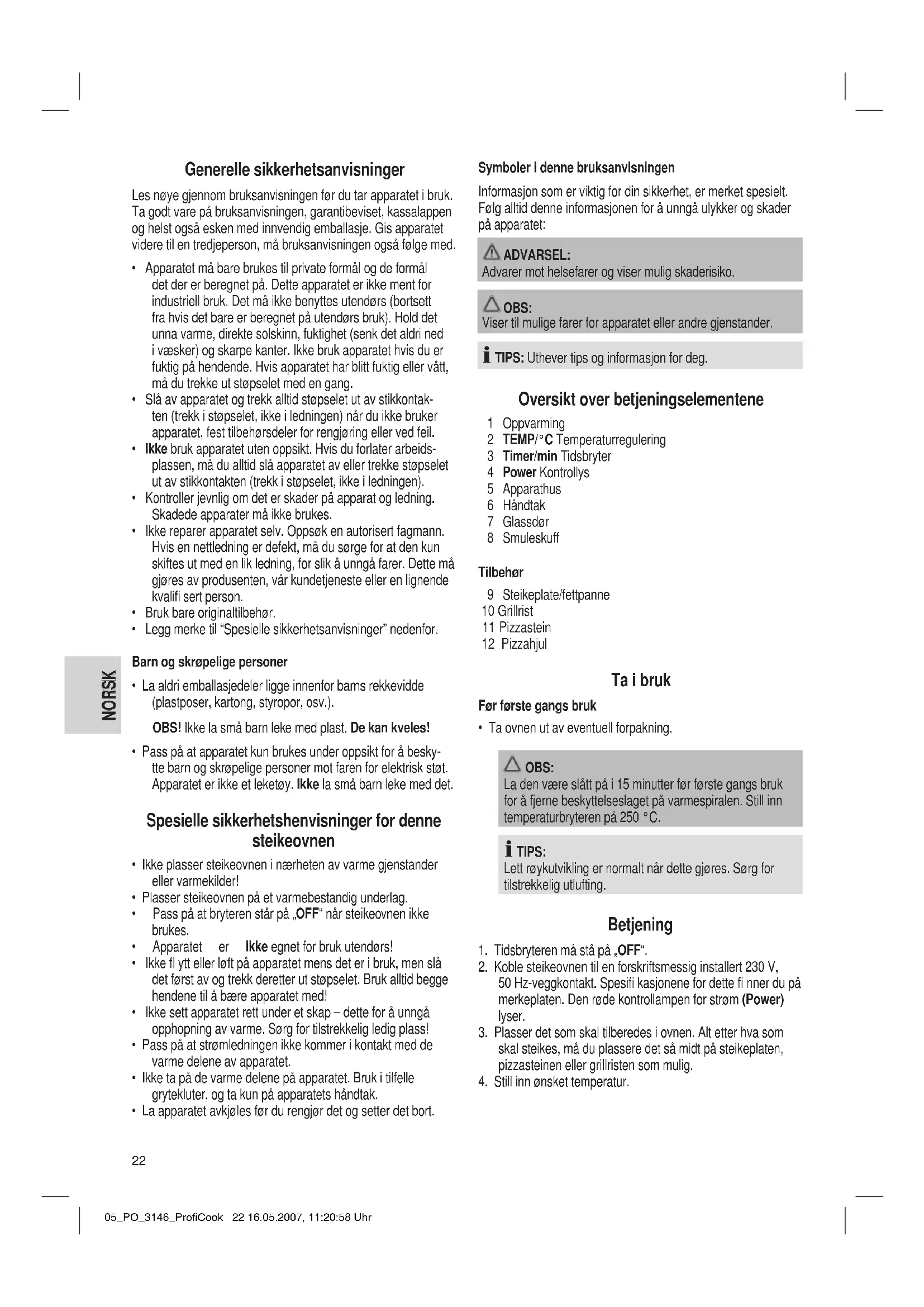 - La apparatet avkjøles før du rengjør det og setter det bort. Symboler i denne bruksanvisningen Informasjon som er viktig for din sikkerhet, er merket spesielt. Følg alltid denne informasjonen for å unngå ulykker og skader på apparatet: ADVARSEL: Advarer mot helsefarer og viser mulig skaderisiko. OBS: Viser til mulige farer for apparatet eller andre gjenstander. TIPS: Uthever tips og informasjon for deg. Oversikt over betjeningselementene 1 Oppvarming 2 TEMP/°C Temperaturregulering 3 Timer/min Tidsbryter 4 Power Kontrollys 5 Apparathus 6 Håndtak 7 Glassdør 8 Smuleskuff Tilbehør 9 Steikeplate/fettpanne 10 Grillrist 11 Pizzastein 12 Pizzahjul Ta i bruk Før første gangs bruk