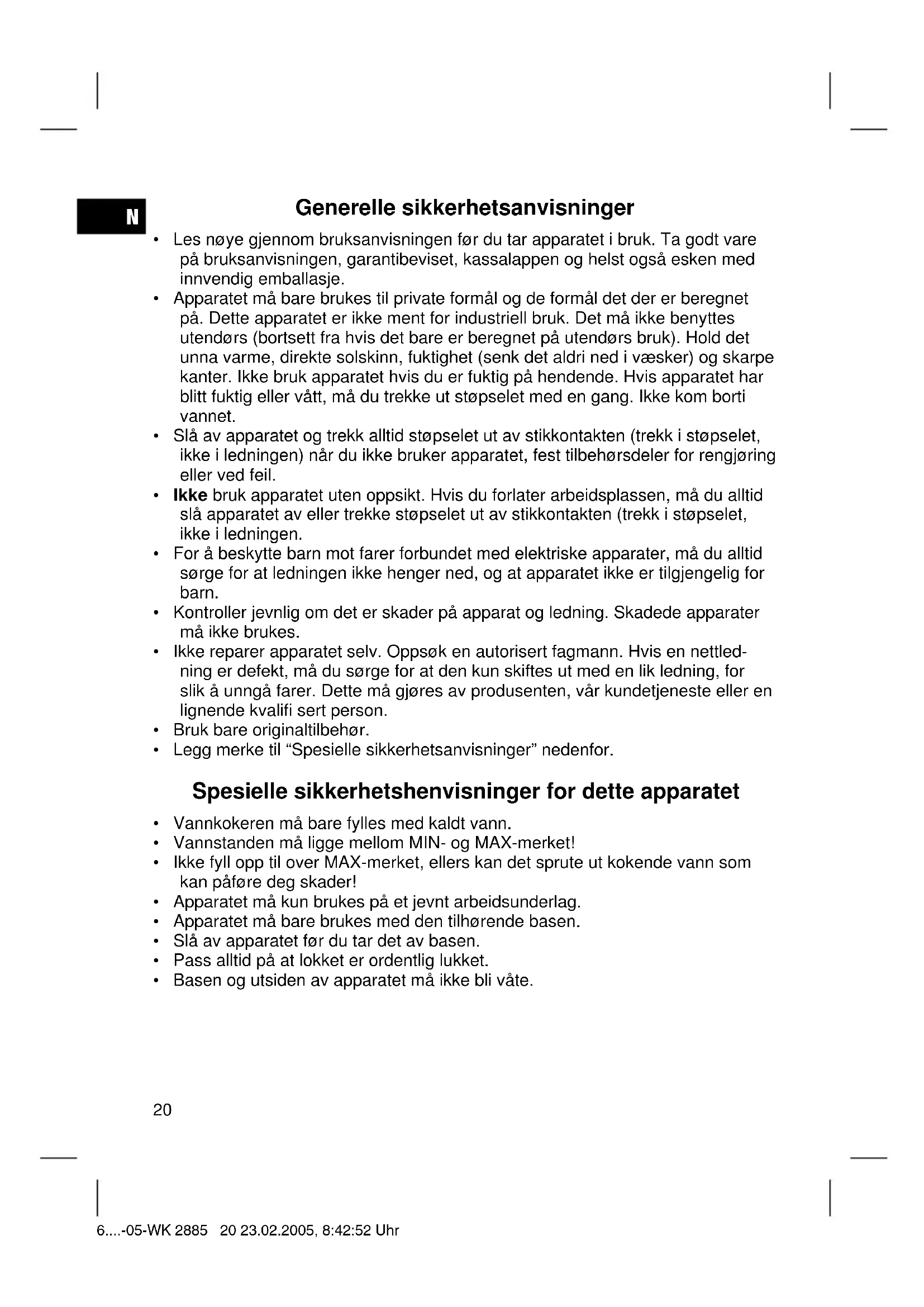 Dette apparatet har blitt testet i henhold til alle aktuelle CE-retningslinjer som det rammes av, f.eks. elektromagnetisk toleranse og direktiver om lavspenning. Det er laget i henhold til dagens nyeste sikkerhetstekniske forskrifter. Med forbehold om tekniske endringer! Garanti For apparat som vi har solgt, påtar vi oss en garanti på 24 måneder fra kjøpsdato (kassalapp). Innenfor garantitiden fjerner vi mangler på apparat eller tilbehør*) uten omkost- ninger hvis manglene skyldes material- eller produksjonsfeil. Dette gjør vi ved reparasjon eller – etter vår vurdering – bytting. Garantiytelser medfører ingen forlengelse av garantitiden, og det oppstår heller ikke noe krav på en ny garanti på grunn av dette! Som garantibevis gjelder kjøpsbeviset. Uten dette beviset kan du ikke få byttet eller reparert apparatet gratis. I forbindelse med garanti ber vi om at du gir hele apparatet i originalemballasjen sammen med kassalappen til din forhandler. *) Skader på tilbehørsdeler fører ikke automatisk til at du får byttet hele apparatet gratis. I slike tilfeller ber vi deg om å henvende deg til vår hotline! Glasskader eller sprekker i plastdeler er i prinsippet kostnadspliktige! Verken defekter på forbrukstilbehør og slitasjedeler (for eksempel motorkull, elte- kroker, drivremmer, ekstra fjernbetjening, ekstra tannbørster, sagblader osv.) eller rengjøring, vedlikehold og utskifting av slitasjedeler går inn under garantien. Slike ting er derfor kostnadspliktige! Garantien utgår ved inngrep utenfra. Etter garantien Etter at garantitiden har gått ut, kan reparasjoner utføres av den aktuelle faghan- delen eller reparasjonsservice mot betaling. 6....-05-WK 2885 22 23.02.2005, 8:42:53 UhrGB