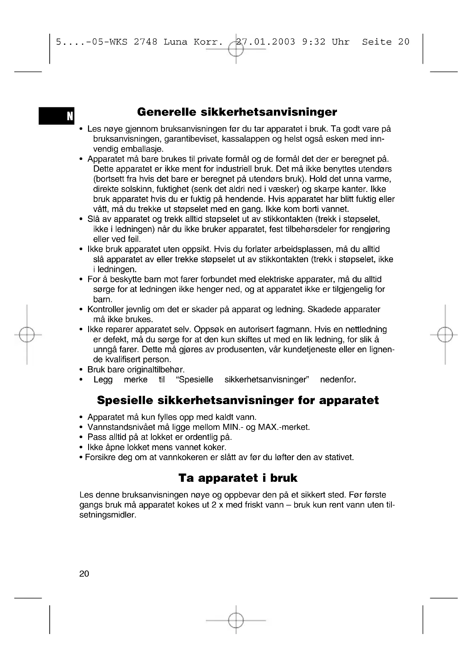 - Forsikre deg om at vannkokeren er slått av før du løfter den av stativet. Ta apparatet i bruk Les denne bruksanvisningen nøye og oppbevar den på et sikkert sted. Før første gangs bruk må apparatet kokes ut 2 x med friskt vann – bruk kun rent vann uten til- setningsmidler.