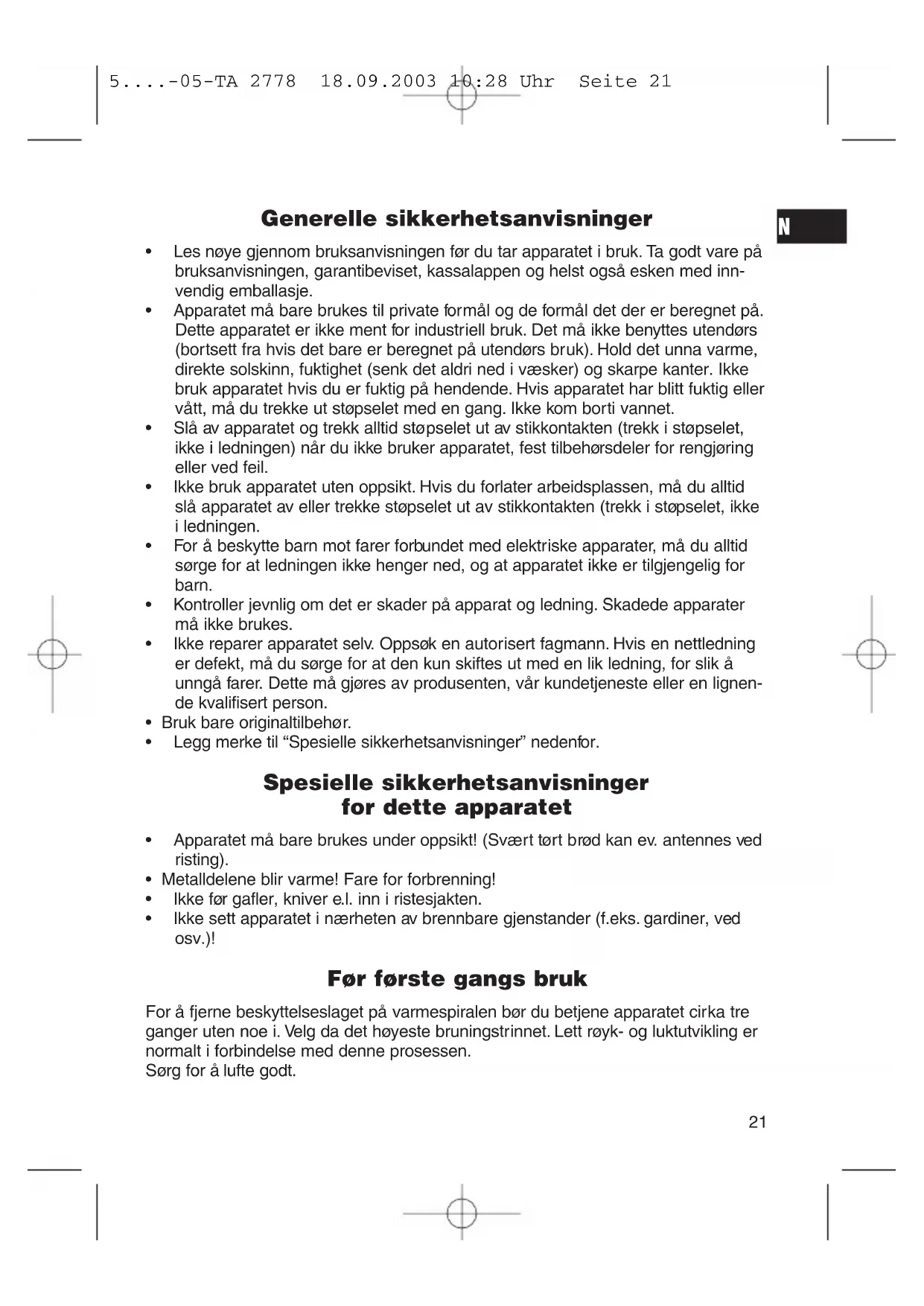 - Apparatet må bare brukes til private formål og de formål det der er beregnet på. Dette apparatet er ikke ment for industriell bruk. Det må ikke benyttes utendørs (bortsett fra hvis det bare er beregnet på utendørs bruk). Hold det unna varme, direkte solskinn, fuktighet (senk det aldri ned i væsker) og skarpe kanter. Ikke bruk apparatet hvis du er fuktig på hendende. Hvis apparatet har blitt fuktig eller vått, må du trekke ut støpselet med en gang. Ikke kom borti vannet.