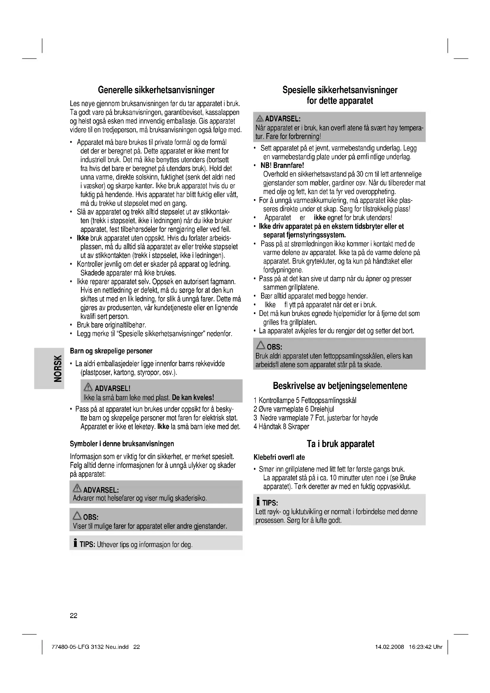 - Pass på at apparatet kun brukes under oppsikt for å besky- tte barn og skrøpelige personer mot faren for elektrisk støt. Apparatet er ikke et leketøy. Ikke la små barn leke med det. Symboler i denne bruksanvisningen Informasjon som er viktig for din sikkerhet, er merket spesielt. Følg alltid denne informasjonen for å unngå ulykker og skader på apparatet: ADVARSEL: Advarer mot helsefarer og viser mulig skaderisiko. OBS: Viser til mulige farer for apparatet eller andre gjenstander. TIPS: Uthever tips og informasjon for deg. Spesielle sikkerhetsanvisninger for dette apparatet ADVARSEL: Når apparatet er i bruk, kan overfl atene få svært høy tempera- tur. Fare for forbrenning!