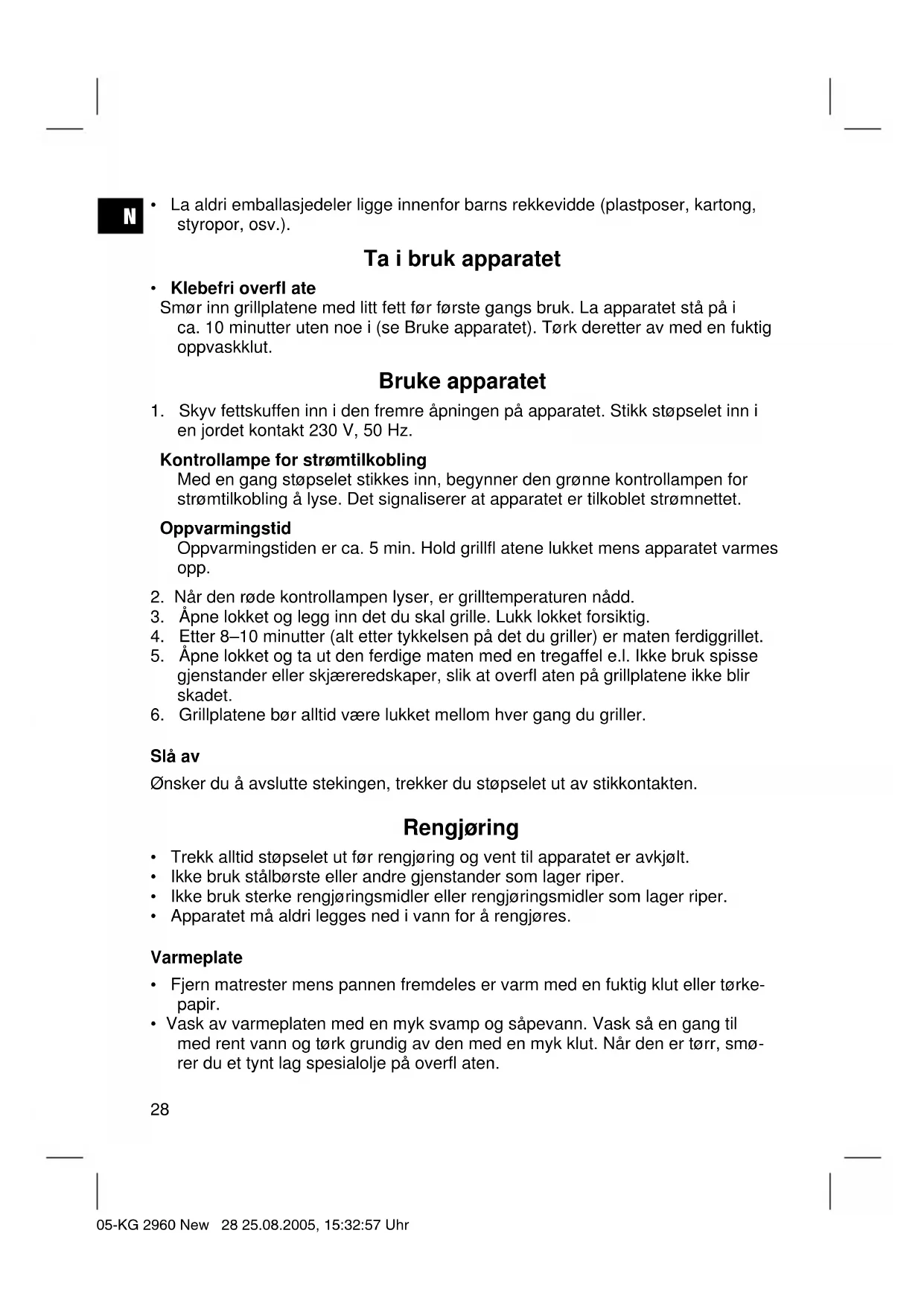 - Rengjør huset med en fuktig klut etter bruk. Tekniske data Modell:........................................................................................................ KG 2960 Spenningsforsyning:............................................................................. 230 V, 50 Hz Inngangsstrøm:............................................................................................. 1400 W Beskyttelsesklasse: ................................................................................................. Ι Dette apparatet har blitt testet i henhold til alle aktuelle CE-retningslinjer som det rammes av, f.eks. elektromagnetisk toleranse og direktiver om lavspenning. Det er laget i henhold til dagens nyeste sikkerhetstekniske forskrifter. Med forbehold om tekniske endringer! Garanti For apparat som vi har solgt, påtar vi oss en garanti på 24 måneder fra kjøpsdato (kassalapp). Innenfor garantitiden fjerner vi mangler på apparat eller tilbehør*) uten omkost- ninger hvis manglene skyldes material- eller produksjonsfeil. Dette gjør vi ved reparasjon eller – etter vår vurdering – bytting. Garantiytelser medfører ingen forlengelse av garantitiden, og det oppstår heller ikke noe krav på en ny garanti på grunn av dette! Som garantibevis gjelder kjøpsbeviset. Uten dette beviset kan du ikke få byttet eller reparert apparatet gratis. I forbindelse med garanti ber vi om at du gir hele apparatet i originalemballasjen sammen med kassalappen til din forhandler. *) Skader på tilbehørsdeler fører ikke automatisk til at du får byttet hele apparatet gratis. I slike tilfeller ber vi deg om å henvende deg til vår hotline! Glasskader eller sprekker i plastdeler er i prinsippet kostnadspliktige! Verken defekter på forbrukstilbehør og slitasjedeler (for eksempel motorkull, elte- kroker, drivremmer, ekstra fjernbetjening, ekstra tannbørster, sagblader osv.) eller rengjøring, vedlikehold og utskifting av slitasjedeler går inn under garantien. Slike ting er derfor kostnadspliktige! 05-KG 2960 New 29 25.08.2005, 15:32:58 UhrN