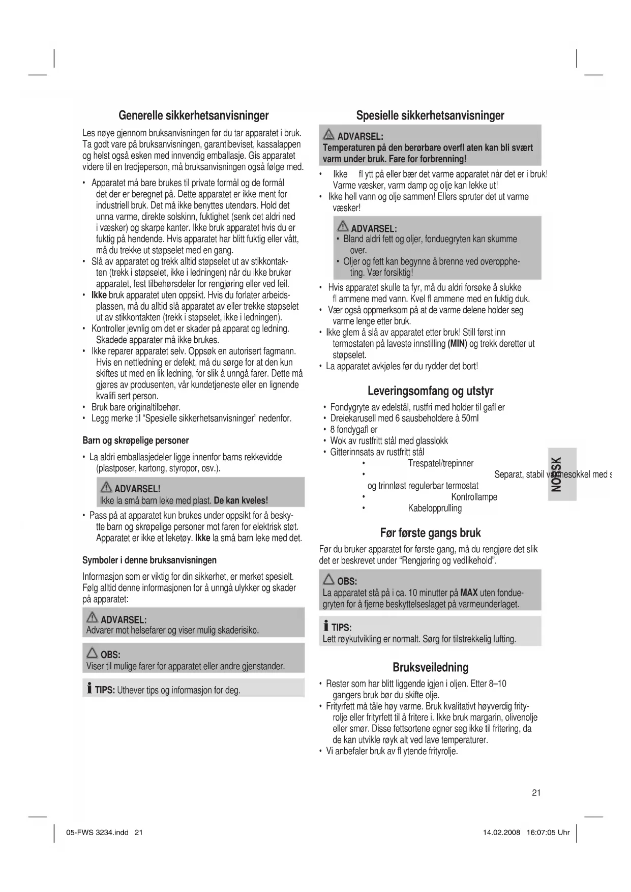 - Kabelopprulling Før første gangs bruk Før du bruker apparatet for første gang, må du rengjøre det slik det er beskrevet under “Rengjøring og vedlikehold”. OBS: La apparatet stå på i ca. 10 minutter på MAX uten fondue- gryten for å fjerne beskyttelseslaget på varmeunderlaget. TIPS: Lett røykutvikling er normalt. Sørg for tilstrekkelig lufting. Bruksveiledning