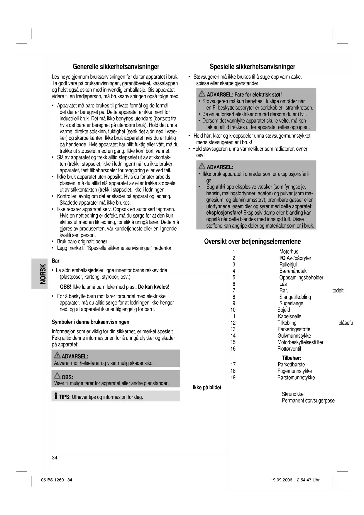 - Apparatet suger ikke opp. Mulig årsak: Støvsugerposen eller oppsamlingsbeholderen er full. Tiltak: Tøm beholderne. Mulig årsak: Pakningen mellom motoren og oppsamlingsbeholderen mangler. Tiltak: Kontroller pakningen. Mulig årsak: Et fremmedlegeme sitter fast i slangen eller munnstykket. Tiltak: Kontroller tilbehøret for fremmedlegemer. Tekniske data Modell:..............................................................................BS 1260 Spenningsforsyning: ..........................................220-240 V, 50 Hz Inngangsstrøm: ................................................................. 1200 W Beskyttelsesklasse:..................................................................... ΙΙ Beholdervolum: ...................................................................18 liter Nytteinnhold ved våtanvending: .........................................12 liter Nytteinnhold ved bruk av permanent fi lter: ...........................6 liter Dette apparatet har blitt testet i henhold til alle aktuelle CE- retningslinjer som det rammes av, f.eks. elektromagnetisk toleranse og direktiver om lavspenning. Det er laget i henhold til dagens nyeste sikkerhetstekniske forskrifter. Med forbehold om tekniske endringer! Garanti For apparat som vi har solgt, påtar vi oss en garanti på 24 måneder fra kjøpsdato (kassalapp). Innenfor garantitiden fjerner vi mangler på apparat eller tilbehør uten omkostninger hvis manglene skyldes material- eller produksjonsfeil. Dette gjør vi ved reparasjon eller – etter vår vurdering – bytting. Garantiytelser medfører ingen forlengelse av garantitiden, og det oppstår heller ikke noe krav på en ny garanti på grunn av dette! Som garantibevis gjelder kjøpsbeviset. Uten dette beviset kan du ikke få byttet eller reparert apparatet gratis. I forbindelse med garanti ber vi om at du gir hele apparatet i ori- ginalemballasjen sammen med kassalappen til din forhandler. Verken defekter på forbrukstilbehør og slitasjedeler eller reng- jøring, vedlikehold og utskifting av slitasjedeler går inn under garantien. Slike ting er derfor kostnadspliktige! Garantien utgår ved inngrep utenfra. Etter garantien Etter at garantitiden har gått ut, kan reparasjoner utføres av den aktuelle faghandelen eller reparasjonsservice mot betaling. 05-BS 1260 37 19.09.2006, 12:54:53 UhrENGLISH ENGLISH