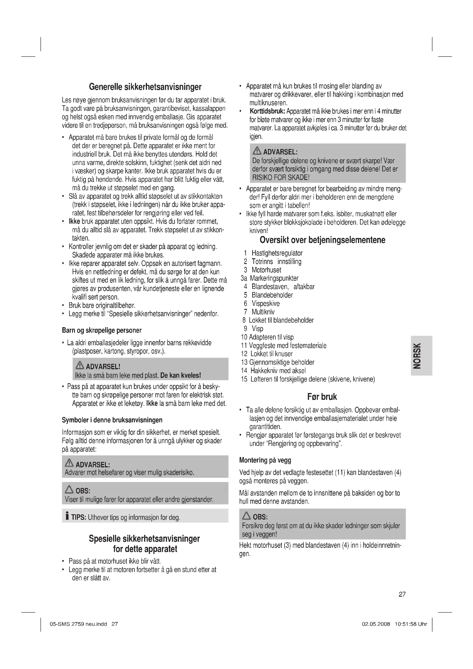 ren helt opp, men maksimalt opp til ¾ av beholderens totale volum. Tabell – funksjon og tilbehør Deler Funksjon Hastighet Brukstid Vispeskive (6) Til blanding og røring av shakes, drikkevarer, omelettdeig, sauser og kosmetiske emulsjoner Trinn •, sett hastighetsregulatoren på 1–2. maks. 3 min. Visp (9) Til visping av krem, marengs (maks. 4 eggehviter), pudding, pisking av sauser, kjeksdeig og andre luftige, skummende matretter Trinn •, sett hastighetsregulatoren på 2–4. maks. 4 min. Multikniv (7) Til hakking, knusing og mosing av kokte grønnsaker, myk frukt og babymat ved tilføring av væske, til mosing av supper og sauser Trinn •, sett hastighetsregulatoren på 1–5 eller trinn •• maks. 3 min. Hakkekniv (14) Til skjæring, hakking og knusing av rått eller kokt kjøtt og trevlete grønnsaker Trinn •, sett hastighetsregulatoren på 1–5 eller trinn •• maks. 3 min. 05-SMS 2759 neu.indd 2805-SMS 2759 neu.indd 28 02.05.2008 10:51:58 Uhr02.05.2008 10:51:58 Uhr29 NORSK NORSK