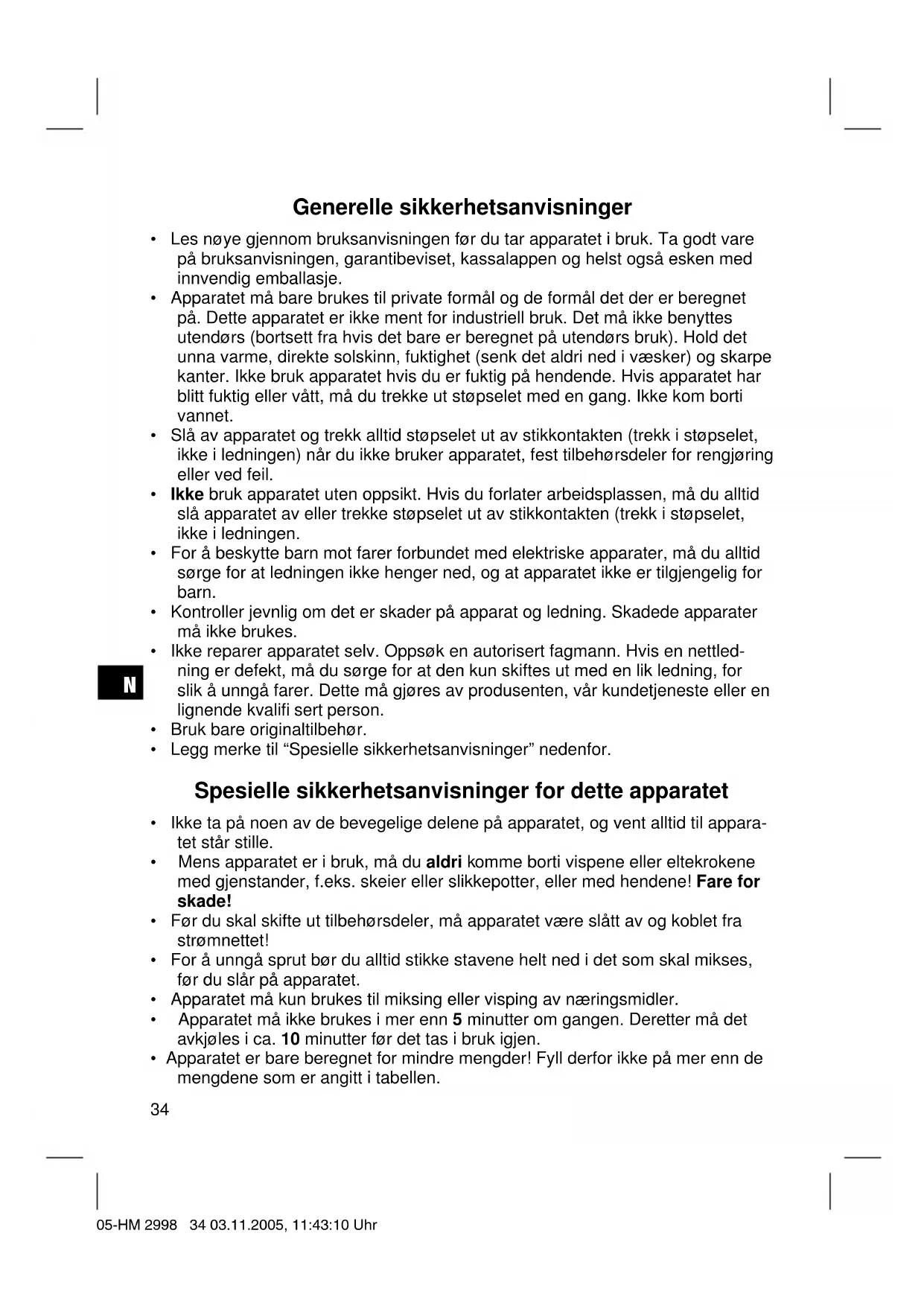- Apparatet er bare beregnet for mindre mengder! Fyll derfor ikke på mer enn de mengdene som er angitt i tabellen. 05-HM 2998 34 03.11.2005, 11:43:10 UhrN