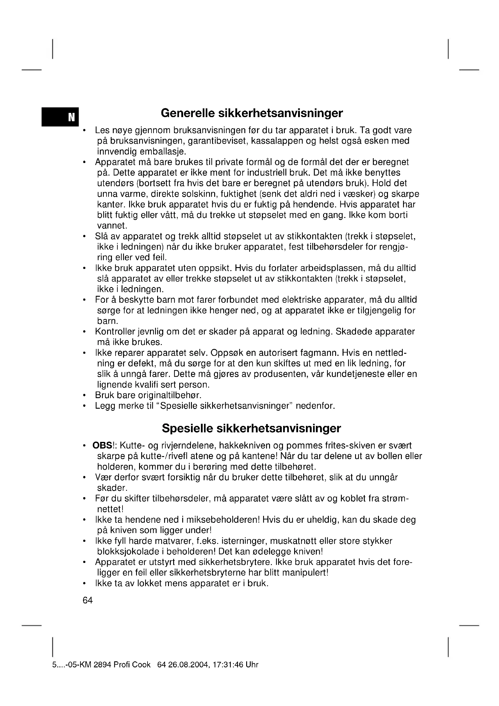 - Avtakbare deler som har vært i kontakt med matvarer (verktøy og boller), kan rengjøres i vanlig oppvaskvann. Dette apparatet har blitt testet i henhold til alle aktuelle CE-retningslinjer som det rammes av, f.eks. elektromagnetisk toleranse og direktiver om lavspenning. Det er laget i henhold til dagens nyeste sikkerhetstekniske forskrifter. Med forbehold om tekniske endringer! 5....-05-KM 2894 Profi Cook 71 26.08.2004, 17:31:50 UhrN