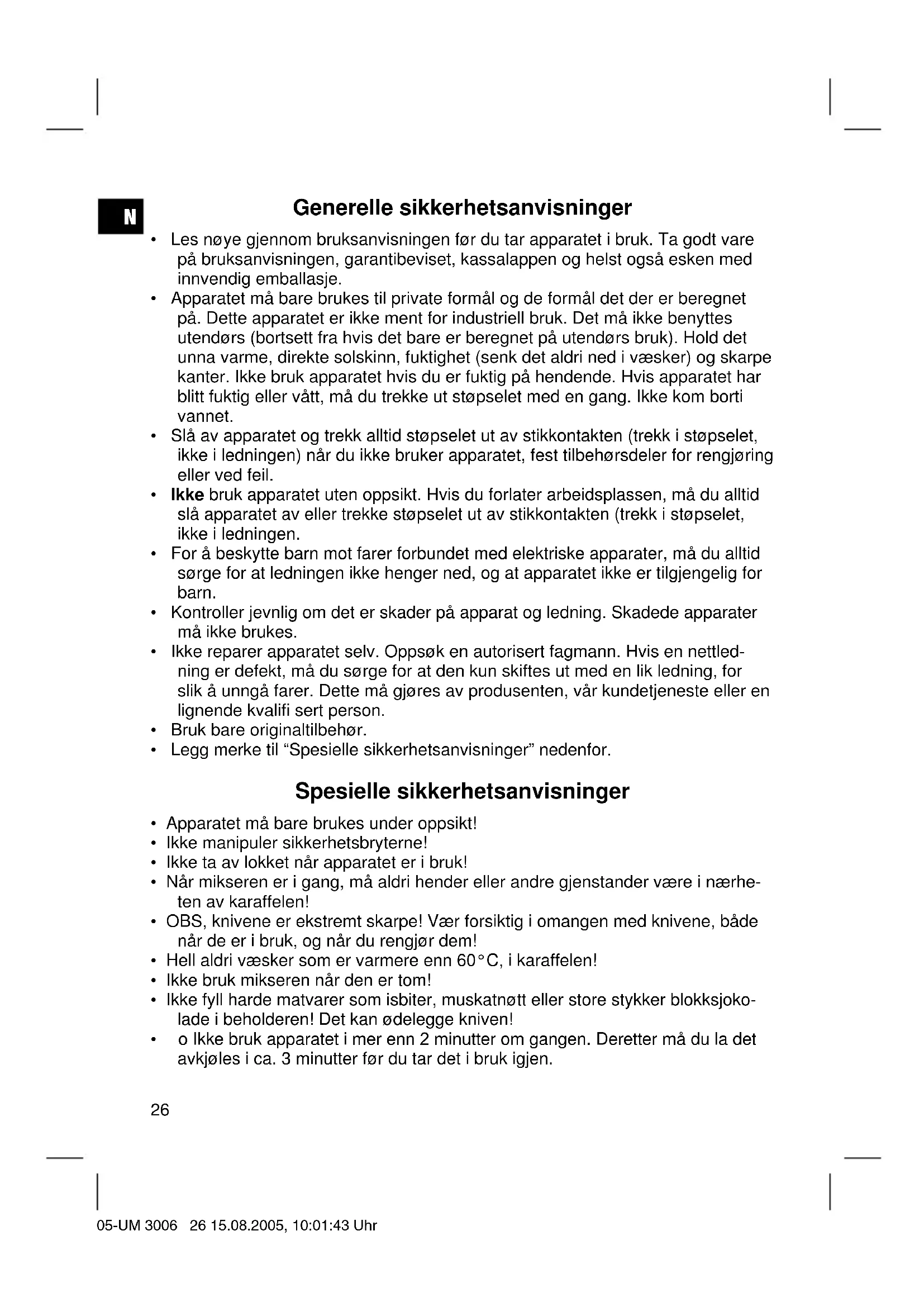 Tekniske data Modell: .......................................................................................................UM 3006 Spenningsforsyning:.............................................................................230 V, 50 Hz Inngangsstrøm:............................................................................................... 350 W Beskyttelsesklasse: ................................................................................................ ΙΙ Korttidsdrift:.....................................................................................................2 min. Påfyllingsmengde: ...................................................................................0,5-1,5 liter Dette apparatet har blitt testet i henhold til alle aktuelle CE-retningslinjer som det rammes av, f.eks. elektromagnetisk toleranse og direktiver om lavspenning. Det er laget i henhold til dagens nyeste sikkerhetstekniske forskrifter. Med forbehold om tekniske endringer! Garanti For apparat som vi har solgt, påtar vi oss en garanti på 24 måneder fra kjøpsdato (kassalapp). Innenfor garantitiden fjerner vi mangler på apparat eller tilbehør*) uten omkost- ninger hvis manglene skyldes material- eller produksjonsfeil. Dette gjør vi ved reparasjon eller – etter vår vurdering – bytting. Garantiytelser medfører ingen forlengelse av garantitiden, og det oppstår heller ikke noe krav på en ny garanti på grunn av dette! Som garantibevis gjelder kjøpsbeviset. Uten dette beviset kan du ikke få byttet eller reparert apparatet gratis. I forbindelse med garanti ber vi om at du gir hele apparatet i originalemballasjen sammen med kassalappen til din forhandler. *) Skader på tilbehørsdeler fører ikke automatisk til at du får byttet hele apparatet gratis. I slike tilfeller ber vi deg om å henvende deg til vår hotline! Glasskader eller sprekker i plastdeler er i prinsippet kostnadspliktige! Verken defekter på forbrukstilbehør og slitasjedeler (for eksempel motorkull, elte- kroker, drivremmer, ekstra fjernbetjening, ekstra tannbørster, sagblader osv.) eller rengjøring, vedlikehold og utskifting av slitasjedeler går inn under garantien. Slike ting er derfor kostnadspliktige! Garantien utgår ved inngrep utenfra. 05-UM 3006 28 15.08.2005, 10:01:44 UhrN