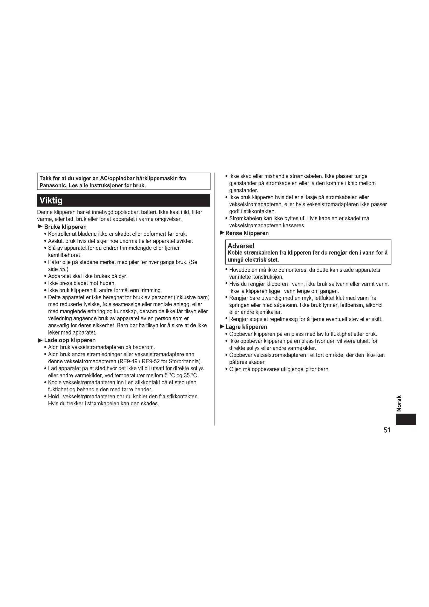 Takk for at du velger en AC/oppladbar hårklippemaskin fra Panasonic. Les alle instruksjoner før bruk. Viktig Denne klipperen har et innebygd oppladbart batteri. Ikke kast i ild, tilfør varme, eller lad, bruk eller forlat apparatet i varme omgivelser. Bruke klipperen Kontroller at bladene ikke er skadet eller deformert før bruk. Avslutt bruk hvis det skjer noe unormalt eller apparatet svikter. Slå av apparatet før du endrer trimmelengde eller fjerner kamtilbehøret. Påfør olje på stedene merket med piler før hver gangs bruk. (Se side 55.) Apparatet skal ikke brukes på dyr. Ikke press bladet mot huden. Ikke bruk klipperen til andre formål enn trimming. Dette apparatet er ikke beregnet for bruk av personer (inklusive barn) med reduserte fysiske, følelsesmessige eller mentale anlegg, eller med manglende erfaring og kunnskap, dersom de ikke får tilsyn eller veiledning angående bruk av apparatet av en person som er ansvarlig for deres sikkerhet. Barn bør ha tilsyn for å sikre at de ikke leker med apparatet. Lade opp klipperen Aldri bruk vekselstrømadapteren på baderom. Aldri bruk andre strømledninger eller vekselstrømadaptere enn denne vekselstrømadapteren (RE9‑49 / RE9‑52 for Storbritannia). Lad apparatet på et sted hvor det ikke vil bli utsatt for direkte sollys eller andre varmekilder, ved temperaturer mellom 5 °C og 35 °C. Kople vekselstrømadapteren inn i en stikkontakt på et sted uten fuktighet og behandle den med tørre hender. Hold i vekselstrømadapteren når du kobler den fra stikkontakten. Hvis du trekker i strømkabelen kan den skades.