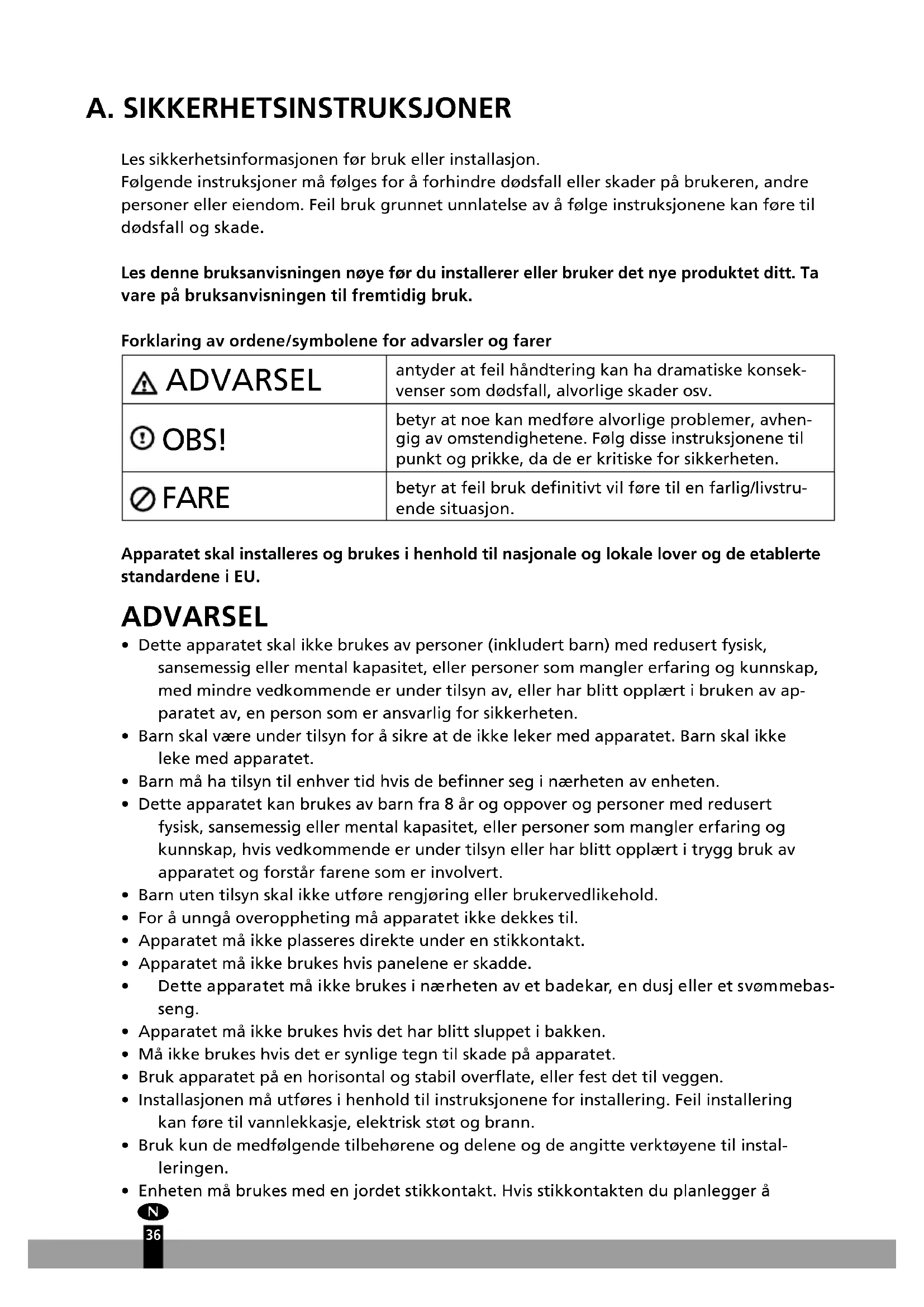 35A. SIKKERHETSINSTRUKSJONER Les sikkerhetsinformasjonen før bruk eller installasjon. Følgende instruksjoner må følges for å forhindre dødsfall eller skader på brukeren, andre personer eller eiendom. Feil bruk grunnet unnlatelse av å følge instruksjonene kan føre til dødsfall og skade. Les denne bruksanvisningen nøye før du installerer eller bruker det nye produktet ditt. Ta vare på bruksanvisningen til fremtidig bruk. Forklaring av ordene/symbolene for advarsler og farer ADVARSEL antyder at feil håndtering kan ha dramatiske konsek- venser som dødsfall, alvorlige skader osv. OBS! betyr at noe kan medføre alvorlige problemer, avhen- gig av omstendighetene. Følg disse instruksjonene til punkt og prikke, da de er kritiske for sikkerheten. FARE betyr at feil bruk denitivt vil føre til en farlig/livstru- ende situasjon. Apparatet skal installeres og brukes i henhold til nasjonale og lokale lover og de etablerte standardene i EU. ADVARSEL