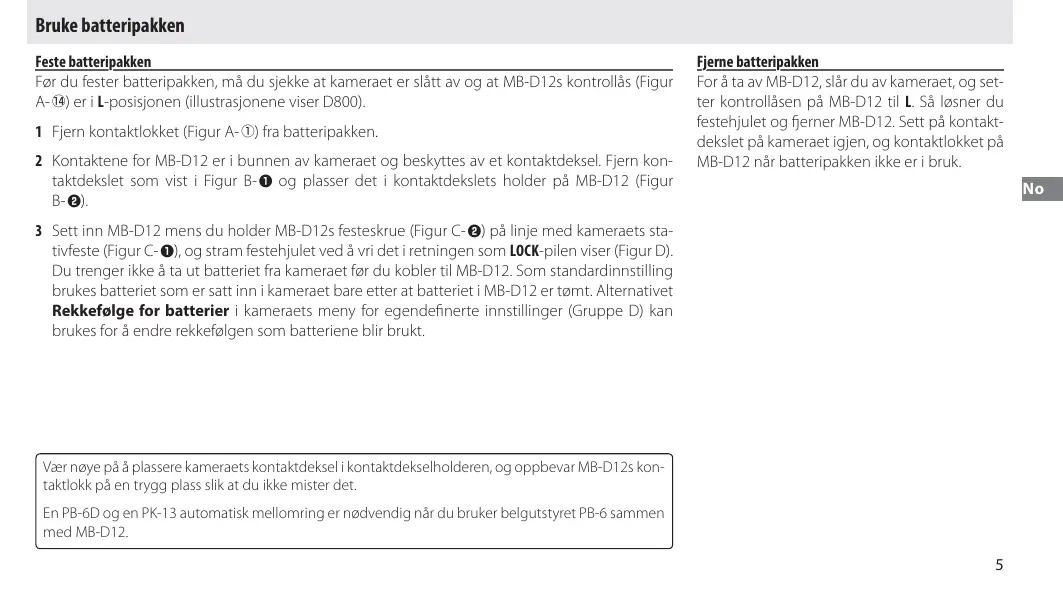 Téléchargez la notice de votre Kamera tilbehør au format PDF gratuitement ! Retrouvez votre notice MB-12 - NIKON et reprennez votre appareil électronique en main. Sur cette page sont publiés tous les documents nécessaires à l'utilisation de votre appareil MB-12 de la marque NIKON.