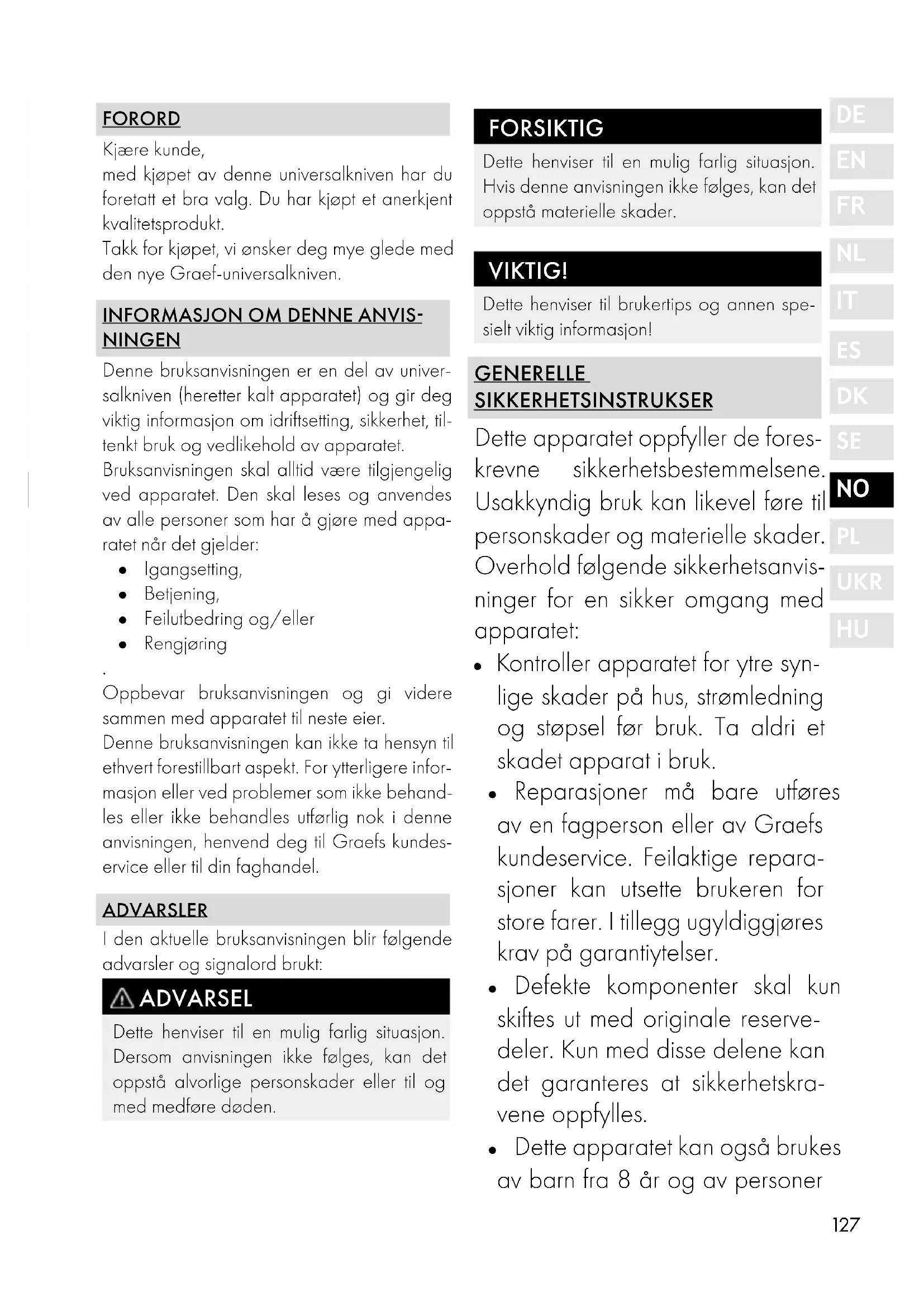 Oppbevar bruksanvisningen og gi videre sammen med apparatet til neste eier. Denne bruksanvisningen kan ikke ta hensyn til ethvert forestillbart aspekt. For ytterligere infor- masjon eller ved problemer som ikke behand- les eller ikke behandles utførlig nok i denne anvisningen, henvend deg til Graefs kundes- ervice eller til din faghandel. ADVARSLER I den aktuelle bruksanvisningen blir følgende advarsler og signalord brukt: ADVARSEL Dette henviser til en mulig farlig situasjon. Dersom anvisningen ikke følges, kan det oppstå alvorlige personskader eller til og med medføre døden. FORSIKTIG Dette henviser til en mulig farlig situasjon. Hvis denne anvisningen ikke følges, kan det oppstå materielle skader. VIKTIG! Dette henviser til brukertips og annen spe- sielt viktig informasjon! GENERELLE SIKKERHETSINSTRUKSER Dette apparatet oppfyller de fores- krevne sikkerhetsbestemmelsene. Usakkyndig bruk kan likevel føre til personskader og materielle skader. Overhold følgende sikkerhetsanvis- ninger for en sikker omgang med apparatet: ● Kontroller apparatet for ytre syn- lige skader på hus, strømledning og støpsel før bruk. Ta aldri et skadet apparat i bruk. ● Reparasjoner må bare utføres av en fagperson eller av Graefs kundeservice. Feilaktige repara- sjoner kan utsette brukeren for store farer. I tillegg ugyldiggjøres krav på garantiytelser. ● Defekte komponenter skal kun skiftes ut med originale reserve- deler. Kun med disse delene kan det garanteres at sikkerhetskra- vene oppfylles. ● Dette apparatet kan også brukes av barn fra 8 år og av personer128 med reduserte fysiske, sensoris- ke eller mentale evner eller med mangel på erfaring og/eller kunnskap, hvis de holdes under tilsyn eller har blitt opplært i sik- ker bruk av apparatet og forstår de farene som oppstår derav. Rengjøring og vedlikehold må ikke utføres av barn, med mindre de er eldre enn 8 år og under tilsyn når de gjør dette. ● Apparatet og apparatets strøm- ledning må holdes unna barn under 8 år. ● Barn skal holdes under tilsyn for å sikre at de ikke leker med ap- paratet. ● Apparatet er ikke beregnet til bruk med et eksternt tidsur eller en separat fjernkontroll. ● Strømledningen skal alltid trekkes ut fra stikkontakten etter støpselet, ikke etter strømledningen. ● Ikke bruk apparatet hvis strøm- ledningen eller støpselet er ska- det. ● Forhindre at det kommer væske på støpselet. ● Hvis tilkoblingsledningen er ska- det, skal den, for å unngå farer, kun skiftes ut av produsenten, kundeservice eller en lignende kvalifisert person. ● Huset på apparatet må ikke un- der noen omstendigheter åpnes. Hvis spenningsførende tilkob- linger berøres og den elektriske eller mekaniske oppbygningen forandres, er det fare for elektrisk støt. ● Berør aldri deler som står under spenning. Dette kan føre til elekt- risk støt og til og med døden. ● Sammenlign tilkoblingsinformas- jonen (spenning og frekvens) på typeskiltet med den for strømnet- tet før du kobler til apparatet. Disse opplysningene må sams- vare, slik at apparatet ikke blir skadet. ● Forsikre deg om at strømkabelen ligger som den skal. Hvis kabelen hektes fast et sted, kan apparatet falle ned fra arbeidsflaten. ● Pakningsmaterialer skal ikke bru- kes til å leke med. Det er fare for kvelning. ● Bruk aldri apparatet i nærheten av en varmekilde. ● Bruk aldri apparatet utendørs og oppbevar det på et tørt sted. ● Slå av apparatet og trekk plug- gen ut av stikkontakten før du veksler tilbehør eller berører de- ler som beveger seg under drift. ● Rengjør alle tilbehørsdeler som kommer i berøring med matvarer umiddelbart etter bruk.129