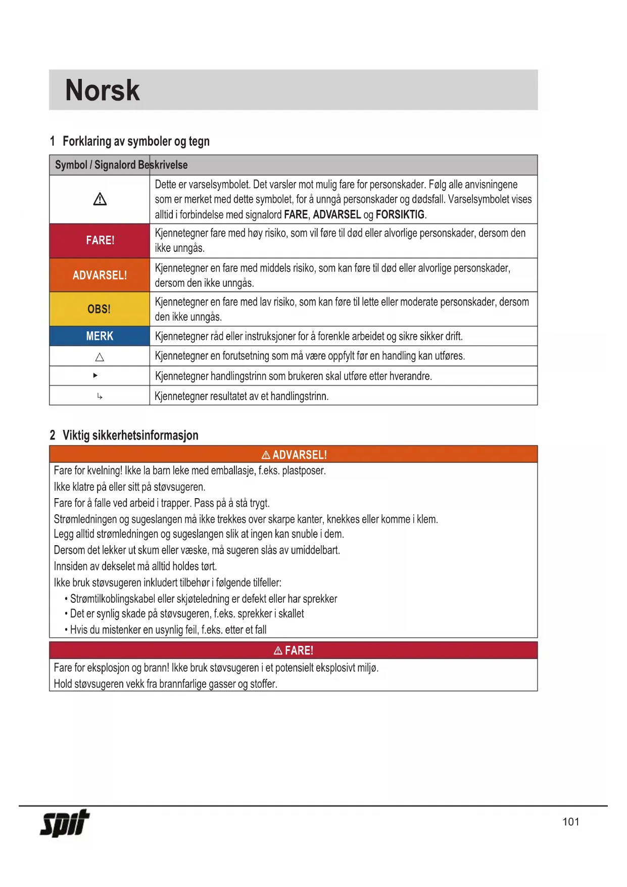 Sugere i klasse H er egnet for oppsuging av tørt, ikke-brennbart støv, kreftfremkallende og sykdomsfremkallende partikler samt ikke-brennbare væsker, trestøv og helseskadelig støv med all MBC. l ADVARSEL! Støvsugere for støvklasse H-asbest er egnet for å støvsuge og skille ut støv som inneholder asbest. Overhold nasjonale forskrifter for drift og vedlikehold av asbestfjerningsverktøy. l ADVARSEL! Denne maskinen skal ikke brukes av personer (inkludert barn) med nedsatte fysiske, sensoriske eller mentale ferdigheter, eller som mangler erfaring og kunnskap om bruken. Barn må holdes under tilsyn for å sikre at de ikke leker med apparatet. Rett aldri dyser, slanger eller rør mot mennesker eller dyr.103 l ADVARSEL! Bruk bare børstene som følger med støvsugeren eller de som er angitt i bruksanvisningen. Bruk av andre børster kan kompromittere sikkerheten. Ved bruk i næringsmiddelsindustrien: Rengjør støvsugeren straks etter bruk og desinser den for å unngå mikrobiell kontaminering. Ikke bruk dampstråler eller høytrykksrensere for rengjøring. Bruk bare støvsugeren under tilsyn. Koble støvsugeren fra strømnettet ved lengre arbeidsavbrudd. Ikke rengjør lterpatronene ved hjelp av trykkluft.