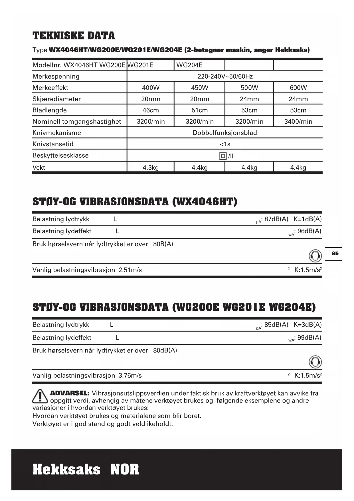 ADVARSEL: Vibrasjonsutslippsverdien under faktisk bruk av kraftverktøyet kan avvike fra oppgitt verdi, avhengig av måtene verktøyet brukes og følgende eksemplene og andre variasjoner i hvordan verktøyet brukes: Hvordan verktøyet brukes og materialene som blir boret. Verktøyet er i god stand og godt veldlikeholdt. Modellnr. WX4046HT WG200E WG201E WG204E Merkespenning 220-240V~50/60Hz Merkeeffekt 400W 450W 500W 600W Skjærediameter 20mm 20mm 24mm 24mm Bladlengde 46cm 51cm 53cm 53cm Nominell tomgangshastighet 3200/min 3200/min 3200/min 3400/min Knivmekanisme Dobbelfunksjonsblad Knivstansetid <1s Beskyttelsesklasse /II Vekt 4.3kg 4.4kg 4.4kg 4.4kgHekksaks nOR