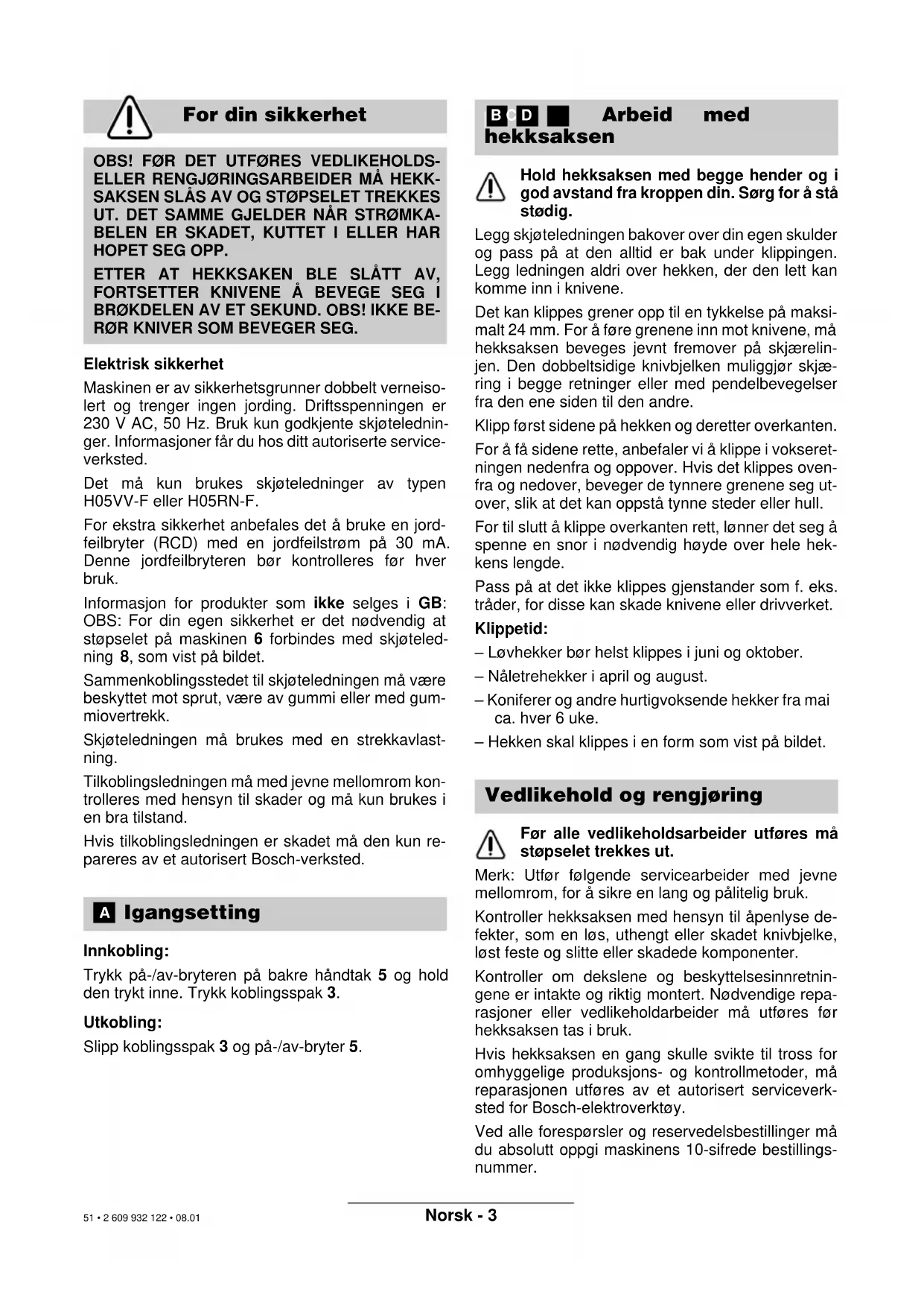 är lägre än 96 dB (A) AHS 40/48/55/60/65, 98 dB (A) AHS 6000/7000. Beräkningsmetod för konformitet enligt bilaga V. Leinfelden, 01.08.2001. Dr. Gerhard Felten Dr. Eckerhard Strötgen Robert Bosch GmbH, Geschäftsbereich Elektrowerkzeuge Ändringar förbehålles Leverantörsansvar Miljöhänsyn Service och kundtjänst Försäkran om överensstämmelse 48 • 2 609 932 122 • 08.01Norsk - 1 OBS! Les nøye gjennom nedenstående anvis- ninger og gjør deg kjent med betjeningselemen- tene og korrekt bruk av hekksaksen. Hvis hekk- saksen ikke brukes på forskriftsmessig måte, kan det føre til alvorlige skader. Ved bruk av elektroverktøy må de generelle og nedenstående sikkerhetsreglene følges, for å redusere risikoen for brann, elektriske støt og skader. Forklaring av bildesymbolene: Les bruksanvisningen. Hekksaken må ikke brukes i regnvær eller på våte hekker. Slå av saksen og trekk ut støpselet før du ut- fører innstillings- og rengjøringsarbeider, når kabelen har hopet seg opp, er kappet el- ler skadet og når hekksaksen er uten opp- syn - også hvis det kun er et lite øyeblikk. ■ Ved bruk må det ikke oppholde seg andre perso- ner eller dyr i en omkrets på 3 m. ■ Ta aldri tak i hekksaksen på knivbjelken. ■ Tillat aldri barn eller andre personer som ikke er kjent med disse anvisningene å bruke hekksak- sen. Nasjonale forskrifter innskrenker eventuelt brukerens alder ytterligere. ■ Klipp aldri hekken når det oppholder seg noen, særskilt barn eller husdyr, i nærheten. ■ Brukeren er ansvarlig for uhell eller skader på an- dre personer eller deres eiendeler. ■ Ikke bruk hekksaksen barbeint eller med åpne sandaler, bruk alltid solide sko og lange bukser. Vi anbefaler å bruke faste hansker, sklifaste sko og vernebriller. Ikke bruk løstsittende eller langt tøy eller smykker som kan komme inn i deler som beveger seg. ■ Kontroll flaten som skal klippes nøye og fjern alle tråder eller andre fremmedlegemer. ■ Før bruk må du alltid se etter om knivene, kniv- skruene og andre deler av skjæreverket er slitt el- ler skadet. Arbeid aldri med skadet eller svært slitt skjæreverk. ■ Før hver bruk må skjøteledningen kontrolleres og skiftes ut etter behov. Skjøteledningen skal være godkjent for utendørs bruk. Beskytt strømkabelen mot varme, olje og skarpe kanter. ■ Gjør deg kjent med hekksaksen, slik at du i et nødstilfelle kan stanse den hurtig. ■ Klipp hekker kun i dagslys eller bra kunstig lys. ■ Hekksaksen må aldri brukes med defekte eller ikke monterte beskyttelsesinnretninger. ■ Sørg for at alle medleverte håndtak og beskyttel- sesinnretninger er montert når hekksaksen tas i bruk. Bruk aldri en ufullstendig hekksaks eller en hekksaks som er endret på en ikke tillatt måte. ■ Bruk alltid hekksaksen med begge hendene. ■ Hold hekksaksen aldri på beskyttelsesinnretnin- gen. ■ Hold kabelen unna arbeidsområdet. ■ Når hekksaksen er i bruk må du alltid sørge for å stå stødig og holde balansen, særskilt ved bruk av trinn eller stiger. ■ Hold godt øye med omgivelsene og vær forberedt på mulige farer som eventuelt kan overhøres un- der arbeidet. ■ Trekk støpselet ut av stikkontakten: – før saksen kontrolleres, en blokkering fjernes el- ler det utføres arbeid på hekksaksen. – etter kontakt med fremmedlegemer. Kontroller om hekksaksen er skadet og la den repareres om nødvendig. – når hekksaksen kontrolleres på grunn av unormal vibrasjon. ■ Kontroll at muttere, bolter og skruer sitter godt fast, slik at hekksaksen befinner seg i en sikker arbeidstilstand. ■ Etter bruk skal hekksaksen lagres sikkert med til- dekkede kniver. Hekksaksen skal oppbevares på et tørt sted, enten for høyt for barn eller avlåst. ■ For sikkerhets skyld må slitte eller skadede deler skiftes ut. ■ Ikke forsøk å reparere maskinen hvis du ikke har en tilsvarende utdannelse. ■ Sørg for at deler som monteres er fra Bosch. Sikkerhetsinformasjoner 49 • 2 609 932 122 • 08.01Norsk - 2 Hekksaks AHS 40 - 24 AHS 48 - 24 AHS 55 - 24S AHS 60 - 24S Bestillingsnummer 0 600 845 0.. 0 600 845 1.. 0 600 845 2.. 0 600 845 4.. Opptatt effekt 500 W 500 W 550 W 550 W Tomgangsturtall 1400 min