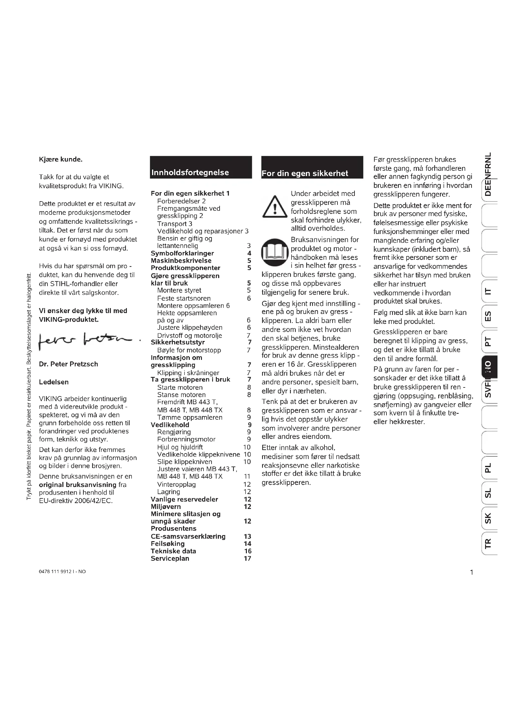Under arbeidet med gressklipperen må forholdsreglene som skal forhindre ulykker, alltid overholdes. Bruksanvisningen for produktet og motor - håndboken må leses i sin helhet før gress - klipperen brukes første gang, og disse må oppbevares tilgjengelig for senere bruk. Gjør deg kjent med innstilling - ene på og bruken av gress - klipperen. La aldri barn eller andre som ikke vet hvordan den skal betjenes, bruke gressklipperen. Minstealderen for bruk av denne gress klipp - eren er 16 år. Gressklipperen må aldri brukes når det er andre personer, spesielt barn, eller dyr i nærheten. Tenk på at det er brukeren av gressklipperen som er ansvar - lig hvis det oppstår ulykker som involverer andre personer eller andres eiendom. Etter inntak av alkohol, medisiner som fører til nedsatt reaksjonsevne eller narkotiske stoffer er det ikke tillatt å bruke gressklipperen. Kjære kunde. Takk for at du valgte et kvalitetsprodukt fra VIKING. Dette produktet er et resultat av moderne produksjonsmetoder og omfattende kvalitetssikrings - tiltak. Det er først når du som kunde er fornøyd med produktet at også vi kan si oss fornøyd. Hvis du har spørsmål om pro - duktet, kan du henvende deg til din STIHL-forhandler eller direkte til vårt salgskontor. Vi ønsker deg lykke til med VIKING-produktet. Dr. Peter Pretzsch Ledelsen VIKING arbeider kontinuerlig med å videreutvikle produkt - spekteret, og vi må av den grunn forbeholde oss retten til forandringer ved produktenes form, teknikk og utstyr. Det kan derfor ikke fremmes krav på grunnlag av informasjon og bilder i denne brosjyren. Denne bruksanvisningen er en original bruksanvisning fra produsenten i henhold til EU-direktiv 2006/42/EC. Innholdsfortegnelse For din egen sikkerhet 1 Forberedelser 2 Fremgangsmåte ved gressklipping 2 Transport 3 Vedlikehold og reparasjoner 3 Bensin er giftig og lettantennelig 3 Symbolforklaringer 4 Maskinbeskrivelse 5 Produktkomponenter 5 Gjøre gressklipperen klar til bruk 5 Montere styret 5 Feste startsnoren 6 Montere oppsamleren 6 Hekte oppsamleren på og av 6 Justere klippehøyden 6 Drivstoff og motorolje 7 Sikkerhetsutstyr 7 Bøyle for motorstopp 7 Informasjon om gressklipping 7 Klipping i skråninger 7 Ta gressklipperen i bruk 7 Starte motoren 8 Stanse motoren 8 Fremdrift MB 443 T, MB 448 T, MB 448 TX 8 Tømme oppsamleren 9 Vedlikehold 9 Rengjøring 9 Forbrenningsmotor 9 Hjul og hjuldrift 10 Vedlikeholde klippeknivene 10 Slipe klippekniven 10 Justere vaieren MB 443 T, MB 448 T, MB 448 TX 11 Vinteropplag 12 Lagring 12 Vanlige reservedeler 12 Miljøvern 12 Minimere slitasjen og unngå skader 12 Produsentens CE-samsvarserklæring 13 Feilsøking 14 Tekniske data 16 Serviceplan 17 For din egen sikkerhet Før gressklipperen brukes første gang, må forhandleren eller annen fagkyndig person gi brukeren en innføring i hvordan gressklipperen fungerer. Dette produktet er ikke ment for bruk av personer med fysiske, følelsesmessige eller psykiske funksjonshemminger eller med manglende erfaring og/eller kunnskaper (inkludert barn), så fremt ikke personer som er ansvarlige for vedkommendes sikkerhet har tilsyn med bruken eller har instruert vedkommende i hvordan produktet skal brukes. Følg med slik at ikke barn kan leke med produktet. Gressklipperen er bare beregnet til klipping av gress, og det er ikke tillatt å bruke den til andre formål. På grunn av faren for per - sonskader er det ikke tillatt å bruke gressklipperen til ren - gjøring (oppsuging, renblåsing, snøfjerning) av gangveier eller som kvern til å finkutte tre- eller hekkrester. Trykt på klorfritt bleket papir. Papiret er resirkulerbart. Beskyttelsesomslaget er halogenfritt.2 0478 111 9912 I - NO