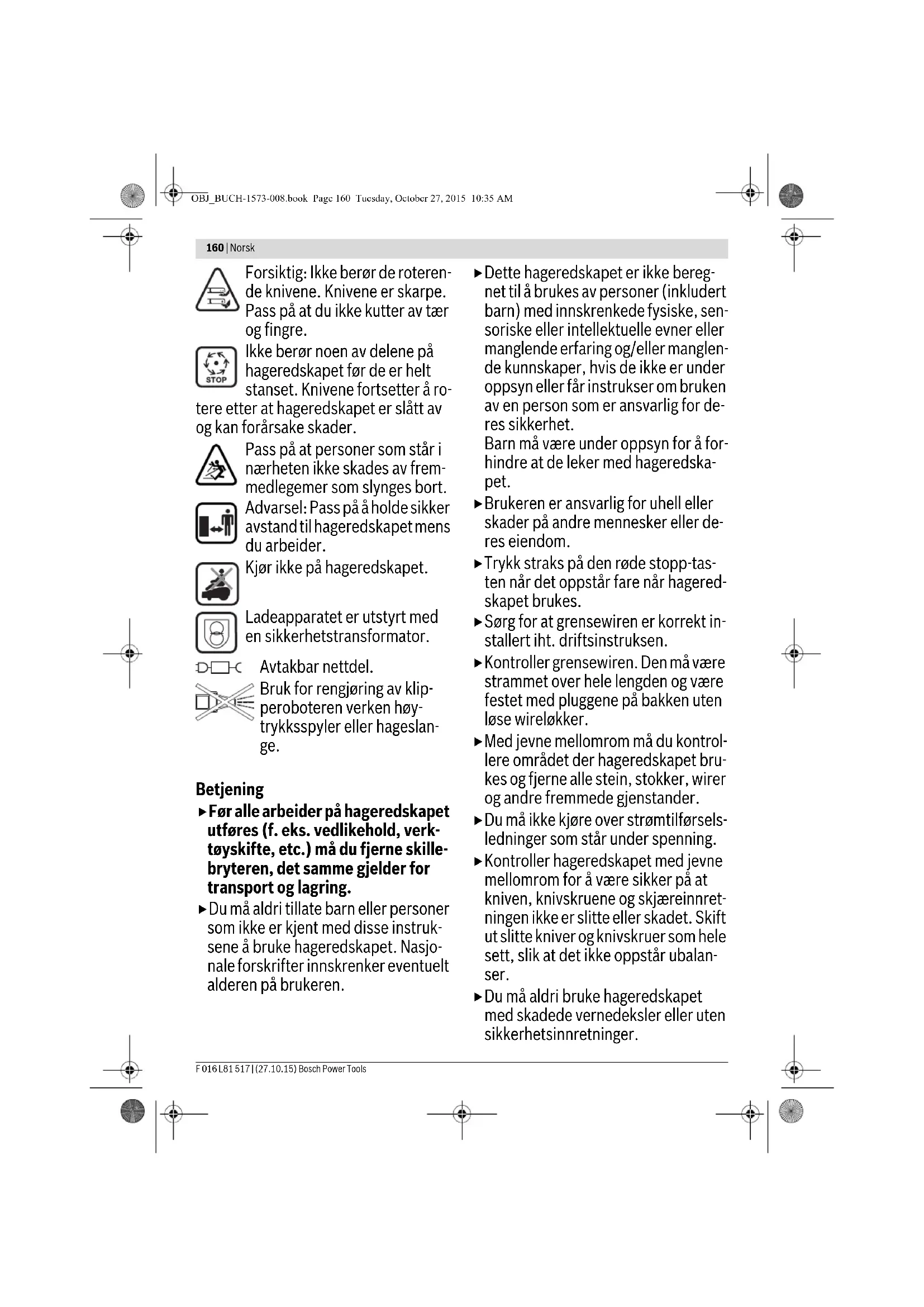*avhengig av apparattype **avhengig av form og kompleksitet av gressflaten (se eksempler i bilde 3) ***avhengig av klippehøyde, gresstilstand og fuktighet Informasjonene gjelder for nominell spenning [U] på 230 V. Ved avvikende spenning og på visse nasjonale modeller kan disse informasjonene variere noe. OBJ_BUCH-1573-008.book Page 164 Tuesday, October 27, 2015 10:35 AMNorsk | 165 Bosch Power Tools F 016 L81 517 | (27.10.15) Støy-/vibrasjonsinformasjon Støyutslippsverdier målt i henhold til EN 50636-2-107. Maskinens A-bedømte typiske støynivå er: Lydtrykknivå 64 dB(A); lydeffektnivå 72 dB(A). Usikkerhet K =2,74 dB. Samsvarserklæring Vi erklærer ved å være alene ansvarlig for at det under «Tek- niske data» beskrevne produktet er i overstemmelse med alle relevante bestemmelser i direktivene 2006/42/EC, 1999/EC (til 13. juni 2016), 2014/53/EU (fra 14. juni 2016), 2000/14/EC, 2009/125/EC, 2011/65/EU inkludert endringer, og følgende standarder: EN 60335-1:2012+A11:2014/EN 50636-2-107:2015 (produktsikkerhet), EN 61558-1:2005+A1:2009/ EN 61558-2-16:2009+A1:2013 (sikkerhet av nettappara- ter), EN 301 489-7 V1.3.1 (EMC og ERM for GSM og DCS), EN 301 511 V9.0.2 (vesentlige krav for GSM 900 og GSM 1800), EN 55014-1:2006+A2:2011 (EMC støyemisjo- ner), EN 55014-2:1997+A2:2008 (EMC støyfasthet). 2000/14/EC: Garantert lydeffektnivå 75 dB(A). Samsvarsbedømmelsesmetode jf. tillegg VI. Produktkategori: 32 Benevnt kontor 2000/14/EC: SRL, Sudbury, England, Nr. 1088 Tekniske data (2006/42/EC, 2000/14/EC) hos: Bosch Lawn and Garden Ltd., PT-HG/ENS-PA2, Stowmarket, Suffolk IP14 1EY, England Robert Bosch GmbH, Power Tools Division 70764 Leinfelden-Echterdingen, GERMANY Leinfelden, 27.10.2015 Forklaring av bildene for installasjonen (se sider 3–14) Strømtilførselsapparat Produktnummer Sveits England Resten av Europa Australia F 016 ... ... L69 117 ... L69 118 ... L69 116 ... L69 119 ... L69 117 ... L69 118 ... L69 116 ... L69 119 ... L69 117 ... L69 118 ... L69 116 ... L69 119 ... L69 117 ... L69 118 ... L69 116 ... L69 119 ... L69 117 ... L69 118 ... L69 116 ... L69 119 ... L69 117 ... L69 118 ... L69 116 ... L69 119 Inngangsspenning (vekselspenning) V 220–240 220 – 240 220 – 240 220 – 240 220 – 240 220 –240 Beskyttelsesklasse /II /II /II /II /II /II Frekvens Hz 50/60 50/60 50/60 50/60 50/60 50/60 Utgangsspenning (likespenning) V4242 42 42 42 42 Beskyttelsestype