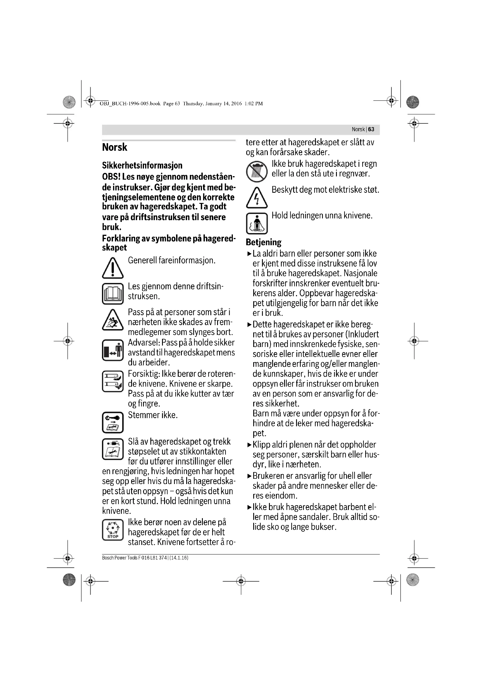 : maksimal lengde 100 m Merk: Hvis det brukes en skjøteledning må denne ha en jordingstråd – som be- skrevet i sikkerhetsforskriftene – som via støpselet er forbundet med jor- dingstråden i det elektriske anlegget. I tvilstilfeller må du spørre en utdannet elektriker eller nærmeste Bosch servi- ceverksted. OBJ_BUCH-1996-005.book Page 65 Thursday, January 14, 2016 1:02 PM66 | Norsk F 016 L81 374 | (14.1.16) Bosch Power Tools OBS! Ikke forskriftsmessige skjø- teledninger kan være farlige. Skjø- teledninger, støpsler og koblinger må være vanntette modeller som er godkjent for utendørs bruk. Kabelforbindelser skal være tørre og ikke ligge på bakken. Til øking av sikkerheten anbefales det å bruke en jordfeilbryter (RCD) med en jordfeilstrøm på maksimalt 30 mA. Denne jordfeilbryteren skal kontrolle- res før hver bruk. Informasjon for produkter som ikke selges i GB: OBS! For din egen sikkerhet er det nød- vendig at støpselet på hageredskapet forbindes med skjøteledningen. Kop- lingen til skjøteledningen må være be- skyttet mot vannsprut, bestå av gummi eller ha gummitrekk. Skjøteledningen må brukes med strekkavlastning. Tilkoplingsledningen må sjekkes mht. skader med jevne mellomrom og må kun brukes i en feilfri tilstand. Hvis tilkoplingsledningen er skadet må den kun repareres av et autorisert Bosch-verksted. Vedlikehold Bruk alltid arbeidshansker når du håndterer eller arbeider i nærhe- ten av de skarpe knivene. Sørg for at alle mutre, bolter og skru- er sitter godt fast, slik at hageredska- pet befinner seg i en sikker arbeidstil- stand. Kontroller gressoppsamlerkurvens tilstand og slitasje med jevne mellom- rom. Sjekk hageredskapet og skift for sik- kerhets skyld ut slitte eller skadede deler. Bruk utelukkende kniver som er be- regnet for dette hageredskapet. Pass på at deler som skal skiftes ut er fra Bosch. Forviss deg før lagringen om at hage- redskapet er rent og uten rester. Ren- gjør om nødvendig med en myk, tørr børste. Symboler Nedenstående symboler er viktige for lesing og forståelse av driftsinstruksen. Legg merke til symbolene og deres betyd- ning. En riktig tolkning av symbolene hjelper deg med å bruke hageredskapet på en bedre og sikrere måte. Formålsmessig bruk Hageredskapet er beregnet til å klippe gressplener på private områder. Symbol Betydning Reaksjonsretning Bevegelsesretning Bruk vernehansker Vekt Innkobling Utkobling Tillatt aksjon Dette er forbudt Tilbehør/reservedeler OBJ_BUCH-1996-005.book Page 66 Thursday, January 14, 2016 1:02 PMNorsk | 67 Bosch Power Tools F 016 L81 374 | (14.1.16) Tekniske data Støy-/vibrasjonsinformasjon Samsvarserklæring Produktkategori: 32 Angitt instans: SRL, Sudbury, England, Nr. 1088 Tekniske data (2006/42/EC, 2000/14/EC) hos: Bosch Lawn and Garden Ltd., PT-HG/ENS-PA2, Stowmarket, Suffolk IP14 1EY, England Robert Bosch Power Tools GmbH 70538 Stuttgart, GERMANY Stuttgart, 01.01.2017 Montering og drift Gressklipper ARM 33/ARM 34/ARM 34 R/