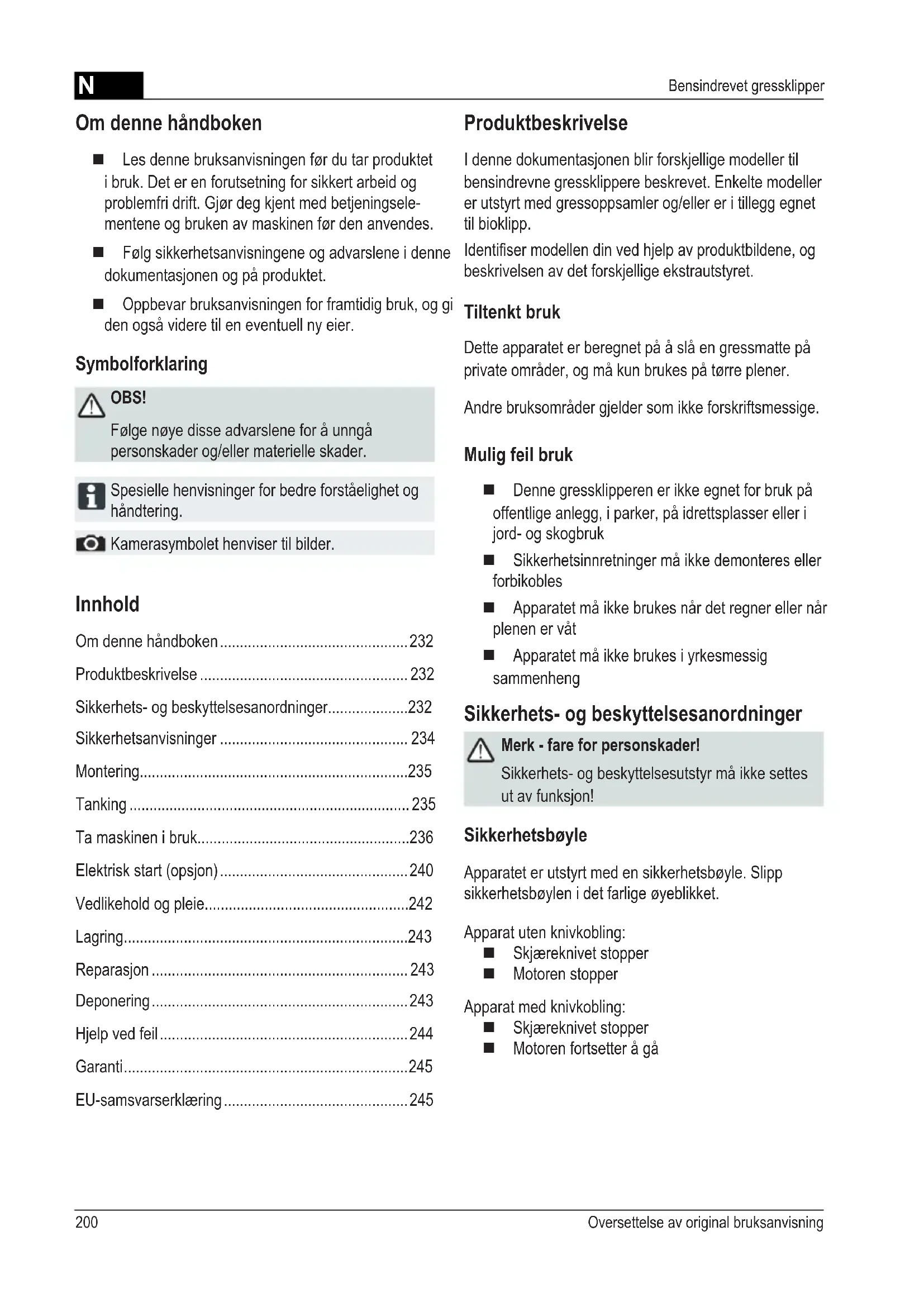 - Bensindrevet gressklipper Innhold Om denne håndboken p. 232