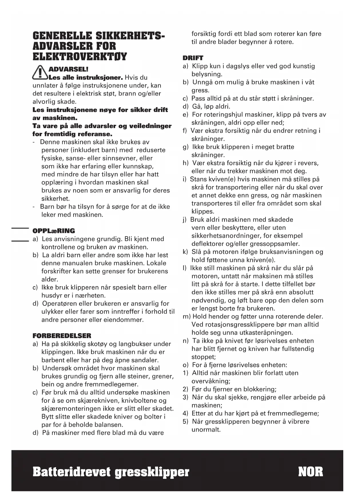 GENERELLE SIKKERHETS- ADVARSLER FOR ELEKTROVERKTØY ADVARSEL! Les alle instruksjoner. Hvis du unnlater å følge instruksjonene under, kan det resultere i elektrisk støt, brann og/eller alvorlig skade. Les instruksjonene nøye for sikker drift av maskinen. Ta vare på alle advarsler og veiledninger for fremtidig referanse. - Denne maskinen skal ikke brukes av personer (inkludert barn) med reduserte fysiske, sanse- eller sinnsevner, eller som ikke har erfaring eller kunnskap, med mindre de har tilsyn eller har hatt opplæring i hvordan maskinen skal brukes av noen som er ansvarlig for deres sikkerhet. - Barn bør ha tilsyn for å sørge for at de ikke leker med maskinen. OPPLæRING a) Les anvisningene grundig. Bli kjent med kontrollene og bruken av maskinen. b) La aldri barn eller andre som ikke har lest denne manualen bruke maskinen. Lokale forskrifter kan sette grenser for brukerens alder. c) Ikke bruk klipperen når spesielt barn eller husdyr er i nærheten. d) Operatøren eller brukeren er ansvarlig for ulykker eller farer som inntreffer i forhold til andre personer eller eiendommer. FORBEREDELSER a) Ha på skikkelig skotøy og langbukser under klippingen. Ikke bruk maskinen når du er barbent eller har på deg åpne sandaler. b) Undersøk området hvor maskinen skal brukes grundig og fjern alle steiner, grener, bein og andre fremmedlegemer. c) Før bruk må du alltid undersøke maskinen for å se om skjærekniven, knivboltene og skjæremonteringen ikke er slitt eller skadet. Bytt slitte eller skadede kniver og bolter i par for å beholde balansen. d) På maskiner med flere blad må du være forsiktig fordi ett blad som roterer kan føre til andre blader begynner å rotere. DRIFT a) Klipp kun i dagslys eller ved god kunstig belysning. b) Unngå om mulig å bruke maskinen i våt gress. c) Pass alltid på at du står støtt i skråninger. d) Gå, løp aldri. e) For roteringshjul maskiner, klipp på tvers av skråningen, aldri opp eller ned; f) Vær ekstra forsiktig når du endrer retning i skråninger. g) Ikke bruk klipperen i meget bratte skråninger. h) Vær ekstra forsiktig når du kjører i revers, eller når du trekker maskinen mot deg.