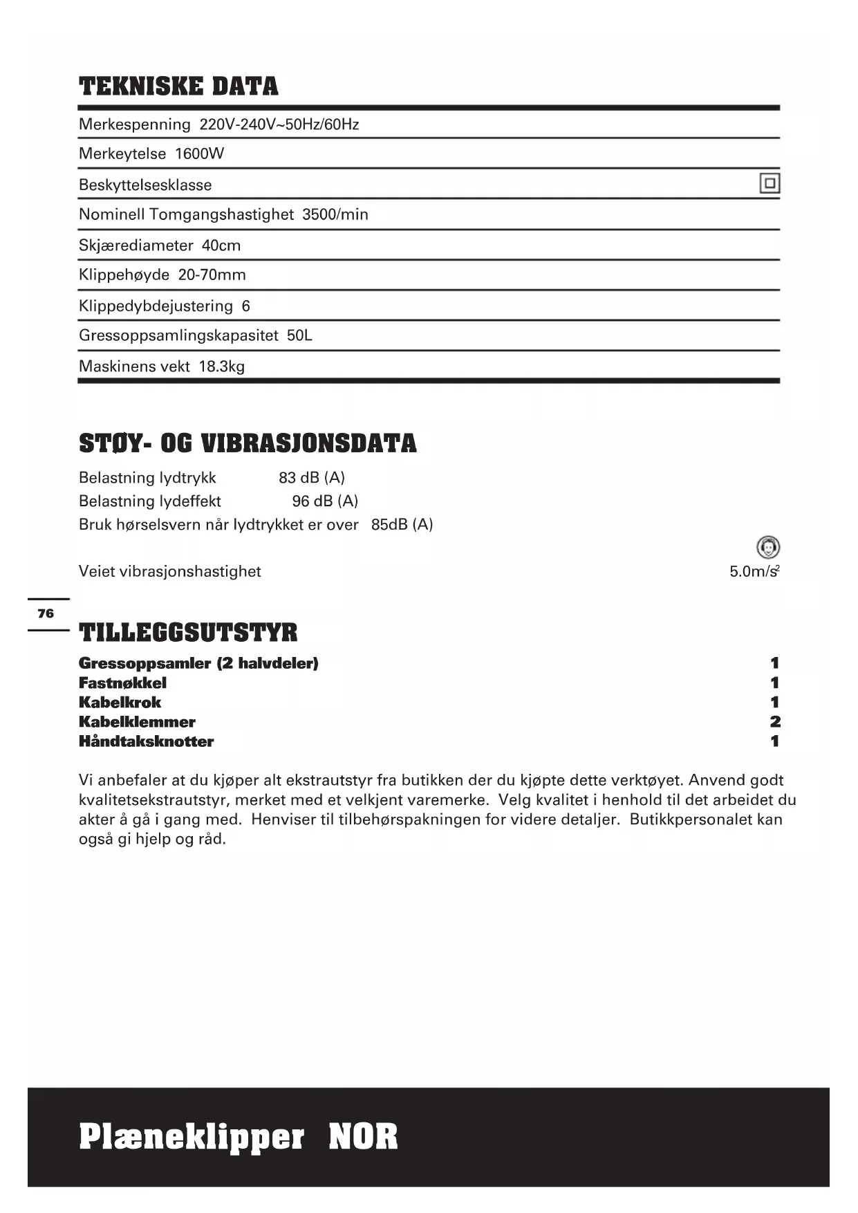 TILLEGGSUTSTYR Gressoppsamler (2 halvdeler) 1 Fastnøkkel 1 Kabelkrok 1 Kabelklemmer 2 Håndtaksknotter 1 Vi anbefaler at du kjøper alt ekstrautstyr fra butikken der du kjøpte dette verktøyet. Anvend godt kvalitetsekstrautstyr, merket med et velkjent varemerke. Velg kvalitet i henhold til det arbeidet du akter å gå i gang med. Henviser til tilbehørspakningen for videre detaljer. Butikkpersonalet kan også gi hjelp og råd.Plæneklipper NOR