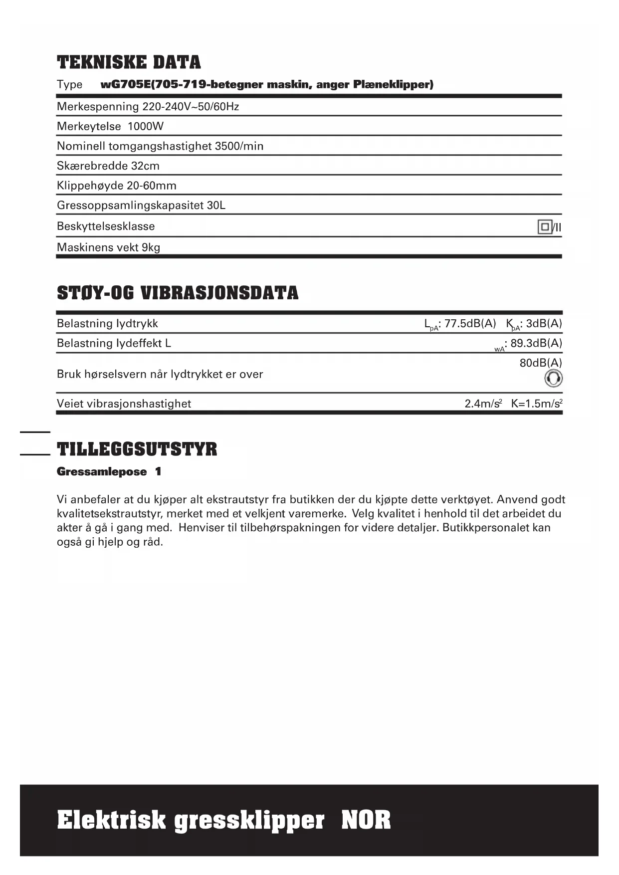 TILLEGGSUTSTYR Gressamlepose 1 Vi anbefaler at du kjøper alt ekstrautstyr fra butikken der du kjøpte dette verktøyet. Anvend godt kvalitetsekstrautstyr, merket med et velkjent varemerke. Velg kvalitet i henhold til det arbeidet du akter å gå i gang med. Henviser til tilbehørspakningen for videre detaljer. Butikkpersonalet kan også gi hjelp og råd.7776