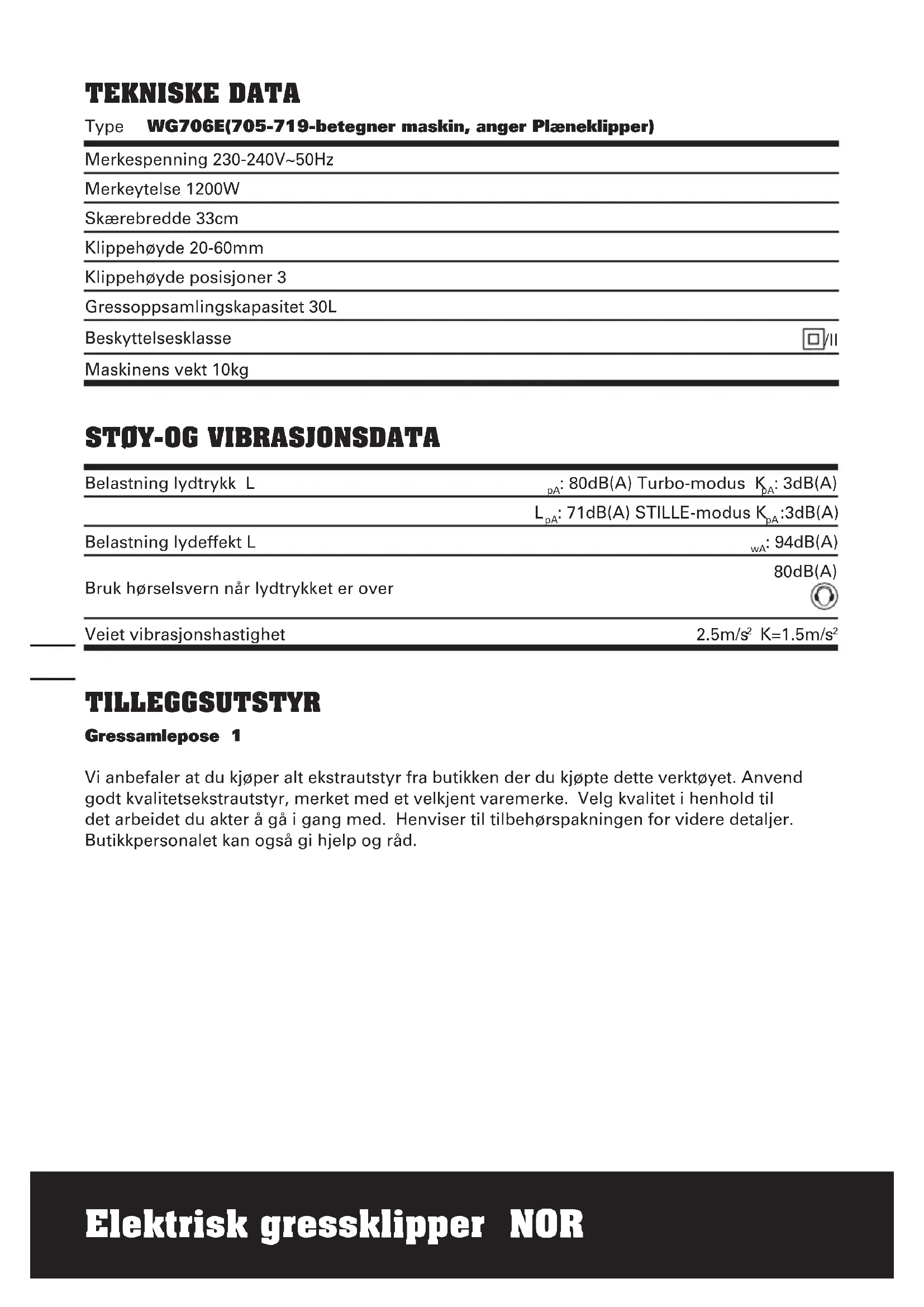 TEKNISKE DATA Type WG706E(705-719-betegner maskin, anger Plæneklipper) Merkespenning 230-240V~50Hz Merkeytelse 1200W Skærebredde 33cm Klippehøyde 20-60mm Klippehøyde posisjoner 3 Gressoppsamlingskapasitet 30L Beskyttelsesklasse /II Maskinens vekt 10kg STØy-OG VIBRASJONSDATA Belastning lydtrykk L