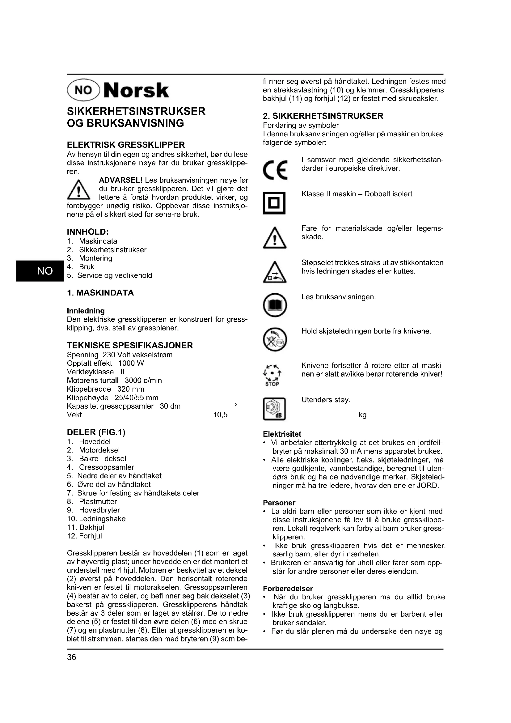 SIKKERHETSINSTRUKSER OG BRUKSANVISNING ELEKTRISK GRESSKLIPPER Av hensyn til din egen og andres sikkerhet, bør du lese disse instruksjonene nøye før du bruker gressklippe- ren. ADVARSEL! Les bruksanvisningen nøye før du bru-ker gressklipperen. Det vil gjøre det lettere å forstå hvordan produktet virker, og forebygger unødig risiko. Oppbevar disse instruksjo- nene på et sikkert sted for sene-re bruk. INNHOLD: