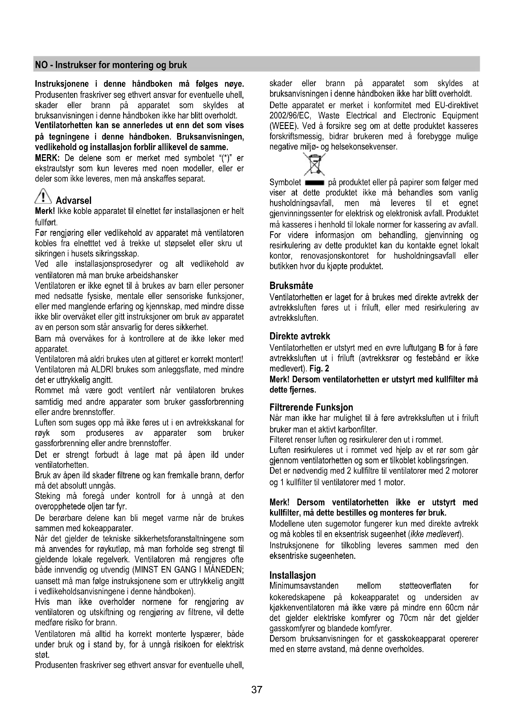 - Kontroller at det ikke ligger igjen tilbehørsutstyr (f.eks. poser med skruer, garantipapir, o.s.v.) inne i ventilatorhetten etter transporten. Ta det i så fall ut og ta vare på det.