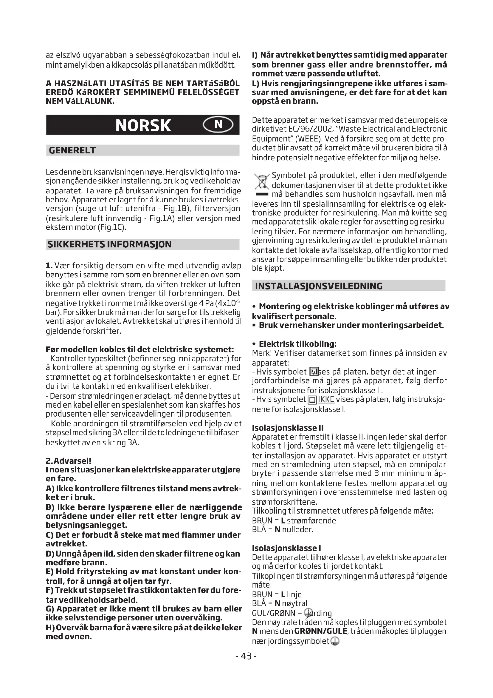 som brenner gass eller andre brennstoffer, må rommet være passende utluftet. L) Hvis rengjøringsinngrepene ikke utføres i sam- svar med anvisningene, er det fare for at det kan oppstå en brann. Dette apparatet er merket i samsvar med det europeiske dirketivet EC/96/2002, “Waste Electrical and Electronic Equipment” (WEEE). Ved å forsikre seg om at dette pro- duktet blir avsatt på korrekt måte vil brukeren bidra til å hindre potensielt negative effekter for miljø og helse. Symbolet på produktet, eller i den medfølgende dokumentasjonen viser til at dette produktet ikke må behandles som husholdningsavfall, men må leveres inn til spesialinnsamling for elektriske og elek- troniske produkter for resirkulering. Man må kvitte seg med apparatet slik lokale regler for avsetting og resirku- lering tilsier. For nærmere informasjon om behandling, gjenvinning og resirkulering av dette produktet må man kontakte det lokale avfallsselskap, offentlig kontor med ansvar for søppelinnsamling eller butikken der produktet ble kjøpt. INSTALLASJONSVEILEDNING
