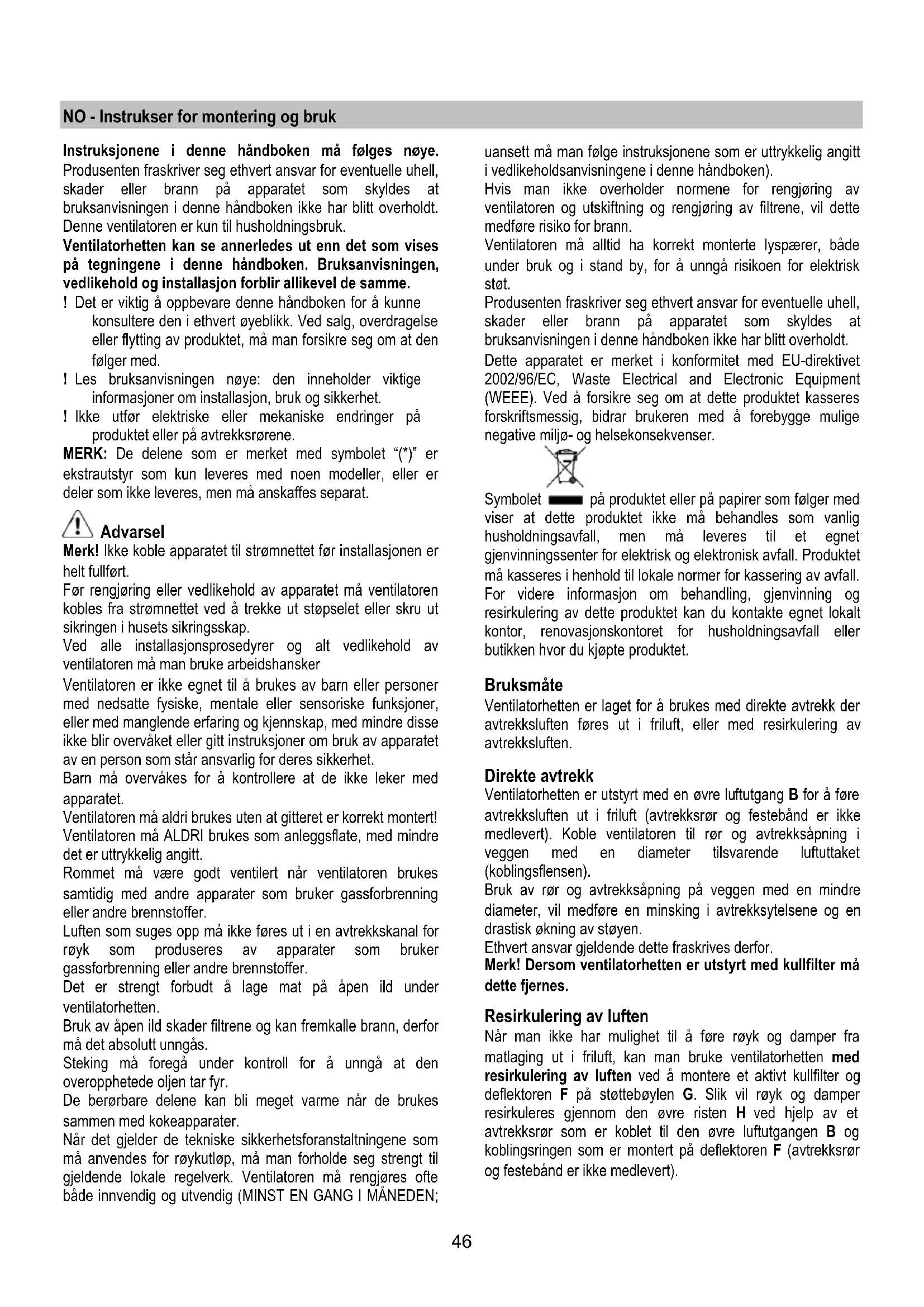 Ventilatorhetten er laget for a brukes med direkte avtrekk der avtrekksluften fores ut i friluft, ell er med resirkulering av avtrekksluften.