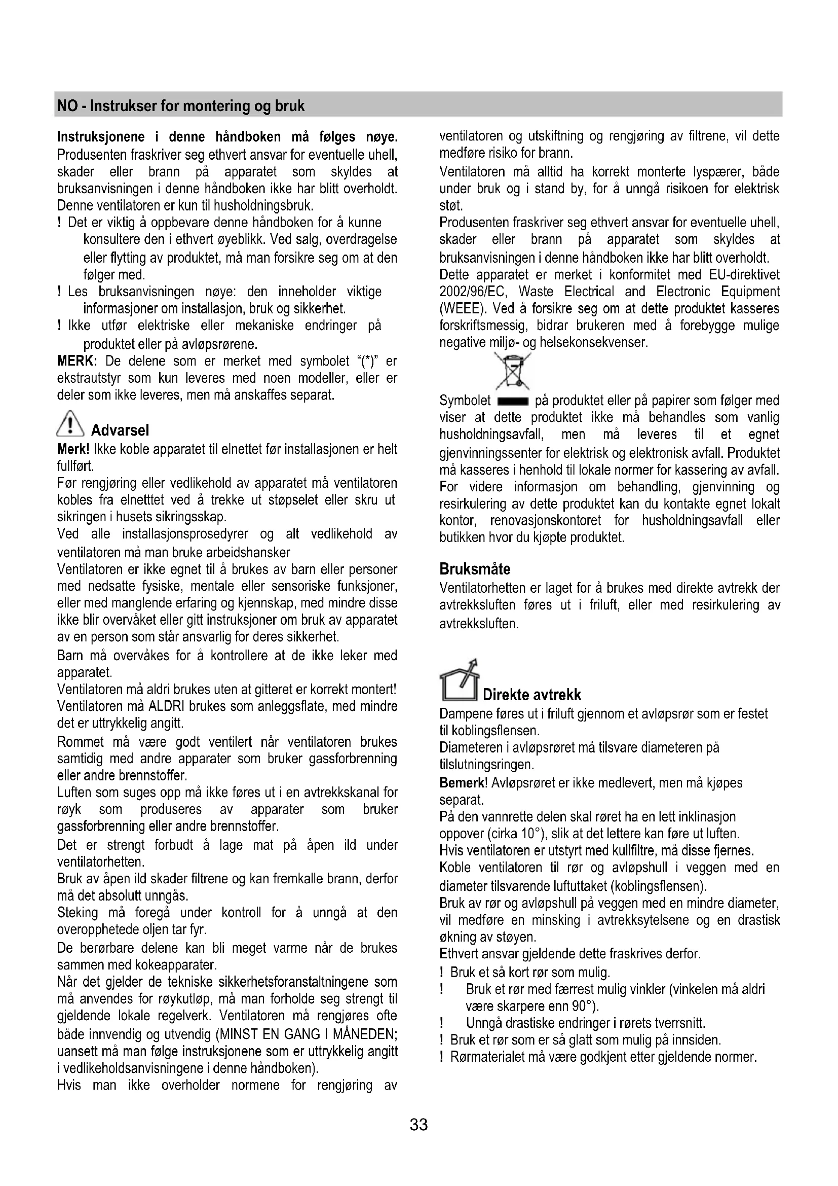 Jos valaistus ei toimi, tarkista että lamput on asennettu oikein paikoilleen ennen kuin otat yhteyttä tekniseen tukeen.33 NO - Instrukser for montering og bruk Instruksjonene i denne håndboken må følges nøye. Produsenten fraskriver seg ethvert ansvar for eventuelle uhell, skader eller brann på apparatet som skyldes at bruksanvisningen i denne håndboken ikke har blitt overholdt. Denne ventilatoren er kun til husholdningsbruk. ! Det er viktig å oppbevare denne håndboken for å kunne konsultere den i ethvert øyeblikk. Ved salg, overdragelse eller flytting av produktet, må man forsikre seg om at den følger med. ! Les bruksanvisningen nøye: den inneholder viktige informasjoner om installasjon, bruk og sikkerhet. ! Ikke utfør elektriske eller mekaniske endringer på produktet eller på avløpsrørene. MERK: De delene som er merket med symbolet “(*)” er ekstrautstyr som kun leveres med noen modeller, eller er deler som ikke leveres, men må anskaffes separat. Advarsel Merk! Ikke koble apparatet til elnettet før installasjonen er helt fullført. Før rengjøring eller vedlikehold av apparatet må ventilatoren kobles fra elnetttet ved å trekke ut støpselet eller skru ut sikringen i husets sikringsskap. Ved alle installasjonsprosedyrer og alt vedlikehold av ventilatoren må man bruke arbeidshansker Ventilatoren er ikke egnet til å brukes av barn eller personer med nedsatte fysiske, mentale eller sensoriske funksjoner, eller med manglende erfaring og kjennskap, med mindre disse ikke blir overvåket eller gitt instruksjoner om bruk av apparatet av en person som står ansvarlig for deres sikkerhet. Barn må overvåkes for å kontrollere at de ikke leker med apparatet. Ventilatoren må aldri brukes uten at gitteret er korrekt montert! Ventilatoren må ALDRI brukes som anleggsflate, med mindre det er uttrykkelig angitt. Rommet må være godt ventilert når ventilatoren brukes samtidig med andre apparater som bruker gassforbrenning eller andre brennstoffer. Luften som suges opp må ikke føres ut i en avtrekkskanal for røyk som produseres av apparater som bruker gassforbrenning eller andre brennstoffer. Det er strengt forbudt å lage mat på åpen ild under ventilatorhetten. Bruk av åpen ild skader filtrene og kan fremkalle brann, derfor må det absolutt unngås. Steking må foregå under kontroll for å unngå at den overopphetede oljen tar fyr. De berørbare delene kan bli meget varme når de brukes sammen med kokeapparater. Når det gjelder de tekniske sikkerhetsforanstaltningene som må anvendes for røykutløp, må man forholde seg strengt til gjeldende lokale regelverk. Ventilatoren må rengjøres ofte både innvendig og utvendig (MINST EN GANG I MÅNEDEN; uansett må man følge instruksjonene som er uttrykkelig angitt i vedlikeholdsanvisningene i denne håndboken). Hvis man ikke overholder normene for rengjøring av ventilatoren og utskiftning og rengjøring av filtrene, vil dette medføre risiko for brann. Ventilatoren må alltid ha korrekt monterte lyspærer, både under bruk og i stand by, for å unngå risikoen for elektrisk støt. Produsenten fraskriver seg ethvert ansvar for eventuelle uhell, skader eller brann på apparatet som skyldes at bruksanvisningen i denne håndboken ikke har blitt overholdt. Dette apparatet er merket i konformitet med EU-direktivet 2002/96/EC, Waste Electrical and Electronic Equipment (WEEE). Ved å forsikre seg om at dette produktet kasseres forskriftsmessig, bidrar brukeren med å forebygge mulige negative miljø- og helsekonsekvenser. Symbolet på produktet eller på papirer som følger med viser at dette produktet ikke må behandles som vanlig husholdningsavfall, men må leveres til et egnet gjenvinningssenter for elektrisk og elektronisk avfall. Produktet må kasseres i henhold til lokale normer for kassering av avfall. For videre informasjon om behandling, gjenvinning og resirkulering av dette produktet kan du kontakte egnet lokalt kontor, renovasjonskontoret for husholdningsavfall eller butikken hvor du kjøpte produktet. Bruksmåte Ventilatorhetten er laget for å brukes med direkte avtrekk der avtrekksluften føres ut i friluft, eller med resirkulering av avtrekksluften. Direkte avtrekk Dampene føres ut i friluft gjennom et avløpsrør som er festet til koblingsflensen. Diameteren i avløpsrøret må tilsvare diameteren på tilslutningsringen. Bemerk! Avløpsrøret er ikke medlevert, men må kjøpes separat. På den vannrette delen skal røret ha en lett inklinasjon oppover (cirka 10°), slik at det lettere kan føre ut luften. Hvis ventilatoren er utstyrt med kullfiltre, må disse fjernes. Koble ventilatoren til rør og avløpshull i veggen med en diameter tilsvarende luftuttaket (koblingsflensen). Bruk av rør og avløpshull på veggen med en mindre diameter, vil medføre en minsking i avtrekksytelsene og en drastisk økning av støyen. Ethvert ansvar gjeldende dette fraskrives derfor. ! Bruk et så kort rør som mulig. ! Bruk et rør med færrest mulig vinkler (vinkelen må aldri være skarpere enn 90°). ! Unngå drastiske endringer i rørets tverrsnitt. ! Bruk et rør som er så glatt som mulig på innsiden. ! Rørmaterialet må være godkjent etter gjeldende normer.34 Resirkulering av luften Luften som suges opp blir renset, og fett og lukter fjernes før den føres tilbake i rommet. Hvis man vil bruke ventilatoren i denne versjonen, er det nødvendig å installere et ekstra filtersystem basert på aktivt kull. Installasjon Minimumsavstanden mellom støtteoverflaten for kokeredskapene på kokeapparatet og undersiden av kjøkkenventilatoren må ikke være på mindre enn 40cm når det gjelder elektriske komfyrer og 65cm når det gjelder gasskomfyrer og blandede komfyrer. Dersom bruksanvisningen for et gasskokeapparat opererer med en større avstand, må denne overholdes. Elektrisk tilslutning Nettspenningen må være i samsvar med den elektriske spenningen som angis på typeskiltet inne i ventilatoren. Hvis det følger med st
