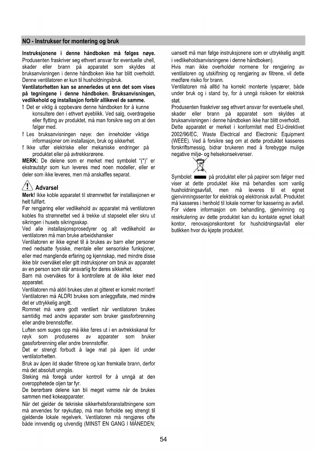 Jos valaistus ei toimi, tarkista että lamput on asennettu oikein paikoilleen ennen kuin otat yhteyttä tekniseen tukeen.54 NO - Instrukser for montering og bruk Instruksjonene i denne håndboken må følges nøye. Produsenten fraskriver seg ethvert ansvar for eventuelle uhell, skader eller brann på apparatet som skyldes at bruksanvisningen i denne håndboken ikke har blitt overholdt. Denne ventilatoren er kun til husholdningsbruk. Ventilatorhetten kan se annerledes ut enn det som vises på tegningene i denne håndboken. Bruksanvisningen, vedlikehold og installasjon forblir allikevel de samme. ! Det er viktig å oppbevare denne håndboken for å kunne konsultere den i ethvert øyeblikk. Ved salg, overdragelse eller flytting av produktet, må man forsikre seg om at den følger med. ! Les bruksanvisningen nøye: den inneholder viktige informasjoner om installasjon, bruk og sikkerhet. ! Ikke utfør elektriske eller mekaniske endringer på produktet eller på avtrekksrørene. MERK: De delene som er merket med symbolet “(*)” er ekstrautstyr som kun leveres med noen modeller, eller er deler som ikke leveres, men må anskaffes separat. Advarsel Merk! Ikke koble apparatet til strømnettet før installasjonen er helt fullført. Før rengjøring eller vedlikehold av apparatet må ventilatoren kobles fra strømnettet ved å trekke ut støpselet eller skru ut sikringen i husets sikringsskap. Ved alle installasjonsprosedyrer og alt vedlikehold av ventilatoren må man bruke arbeidshansker Ventilatoren er ikke egnet til å brukes av barn eller personer med nedsatte fysiske, mentale eller sensoriske funksjoner, eller med manglende erfaring og kjennskap, med mindre disse ikke blir overvåket eller gitt instruksjoner om bruk av apparatet av en person som står ansvarlig for deres sikkerhet. Barn må overvåkes for å kontrollere at de ikke leker med apparatet. Ventilatoren må aldri brukes uten at gitteret er korrekt montert! Ventilatoren må ALDRI brukes som anleggsflate, med mindre det er uttrykkelig angitt. Rommet må være godt ventilert når ventilatoren brukes samtidig med andre apparater som bruker gassforbrenning eller andre brennstoffer. Luften som suges opp må ikke føres ut i en avtrekkskanal for røyk som produseres av apparater som bruker gassforbrenning eller andre brennstoffer. Det er strengt forbudt å lage mat på åpen ild under ventilatorhetten. Bruk av åpen ild skader filtrene og kan fremkalle brann, derfor må det absolutt unngås. Steking må foregå under kontroll for å unngå at den overopphetede oljen tar fyr. De berørbare delene kan bli meget varme når de brukes sammen med kokeapparater. Når det gjelder de tekniske sikkerhetsforanstaltningene som må anvendes for røykutløp, må man forholde seg strengt til gjeldende lokale regelverk. Ventilatoren må rengjøres ofte både innvendig og utvendig (MINST EN GANG I MÅNEDEN; uansett må man følge instruksjonene som er uttrykkelig angitt i vedlikeholdsanvisningene i denne håndboken). Hvis man ikke overholder normene for rengjøring av ventilatoren og utskiftning og rengjøring av filtrene, vil dette medføre risiko for brann. Ventilatoren må alltid ha korrekt monterte lyspærer, både under bruk og i stand by, for å unngå risikoen for elektrisk støt. Produsenten fraskriver seg ethvert ansvar for eventuelle uhell, skader eller brann på apparatet som skyldes at bruksanvisningen i denne håndboken ikke har blitt overholdt. Dette apparatet er merket i konformitet med EU-direktivet 2002/96/EC, Waste Electrical and Electronic Equipment (WEEE). Ved å forsikre seg om at dette produktet kasseres forskriftsmessig, bidrar brukeren med å forebygge mulige negative miljø- og helsekonsekvenser. Symbolet på produktet eller på papirer som følger med viser at dette produktet ikke må behandles som vanlig husholdningsavfall, men må leveres til et egnet gjenvinningssenter for elektrisk og elektronisk avfall. Produktet må kasseres i henhold til lokale normer for kassering av avfall. For videre informasjon om behandling, gjenvinning og resirkulering av dette produktet kan du kontakte egnet lokalt kontor, renovasjonskontoret for husholdningsavfall eller butikken hvor du kjøpte produktet.55 Bruksmåte Ventilatorhetten er laget for å brukes med direkte avtrekk der avtrekksluften føres ut i friluft, eller med resirkulering av avtrekksluften. Direkte avtrekk Dampene føres ut i friluft gjennom et avløpsrør som er festet til koblingsflensen. Diameteren i avløpsrøret må tilsvare diameteren på tilslutningsringen. Bemerk! Avløpsrøret er ikke medlevert, men må kjøpes separat. På den vannrette delen skal røret ha en lett inklinasjon oppover (cirka 10°), slik at det lettere kan føre ut luften. Hvis ventilatoren er utstyrt med kullfiltre, må disse fjernes. Koble ventilatoren til rør og avtrekksåpning i veggen med en diameter tilsvarende luftuttaket (koblingsflensen). Bruk av rør og avtrekksåpning på veggen med en mindre diameter, vil medføre en minsking i avtrekksytelsene og en drastisk økning av støyen. Ethvert ansvar gjeldende dette fraskrives derfor. ! Bruk et så kort rør som mulig. ! Bruk et rør med færrest mulig vinkler (vinkelen må aldri være skarpere enn 90°). ! Unngå drastiske endringer i rørets tverrsnitt. ! Bruk et rør som er så glatt som mulig på innsiden. ! Rørmaterialet må være godkjent etter gjeldende normer. Resirkulering av luften Luften som suges opp blir renset, og fett og lukter fjernes før den føres tilbake i rommet. Hvis man vil bruke ventilatoren i denne versjonen, er det nødvendig å installere et ekstra filtersystem basert på aktivt kull. Modellene uten sugemotor fungerer kun med direkte avtrekk og må kobles til en eksentrisk sugeenhet (ikke medlevert). Instruksjonene for tilkobling leveres sammen med den eksentriske sugeenheten. Installasjon Minimumsavstanden mellom koketoppen og undersiden av kjøkkenventilatoren må ikke være på mindre enn 50cm når det gjelder elektri