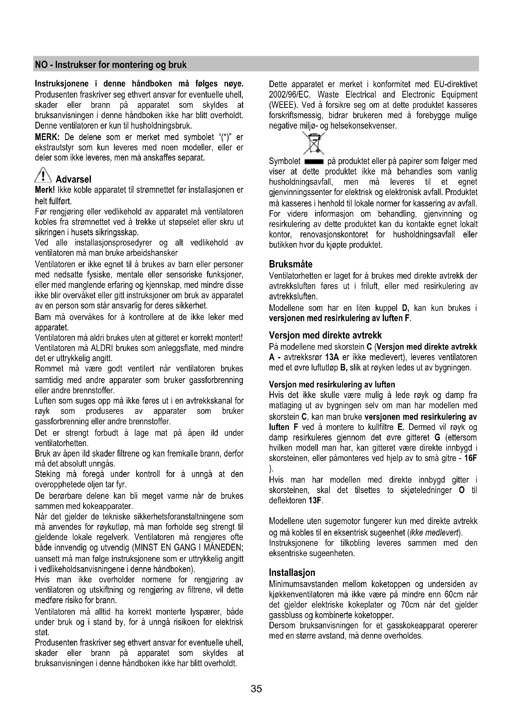 Hvis man har modellen med direkte innbygd gitter i skorsteinen, skal det tilsettes to skjøteledninger O til deflektoren 13F. Modellene uten sugemotor fungerer kun med direkte avtrekk og må kobles til en eksentrisk sugeenhet (ikke medlevert). Instruksjonene for tilkobling leveres sammen med den eksentriske sugeenheten. Installasjon Minimumsavstanden mellom koketoppen og undersiden av kjøkkenventilatoren må ikke være på mindre enn 60cm når det gjelder elektriske kokeplater og 70cm når det gjelder gassbluss og kombinerte koketopper. Dersom bruksanvisningen for et gasskokeapparat opererer med en større avstand, må denne overholdes.36 Elektrisk tilslutning Nettspenningen må være i samsvar med den elektriske spenningen som angis på typeskiltet inne i ventilatoren. Hvis det følger med støpsel, kobles ventilatoren til en lett tilgjengelig stikkontakt som er godkjent i henhold til gjeldende normer. Stikkontakten må være lett tilgjengelig også etter installasjonen. Hvis det ikke følger med støpsel (direkte kobling til strømnettet), eller stikkontakten selv etter installasjonen ikke er lett tilgjengelig, må man sette på en godkjent topolet bryter som garanterer fullstendig frakobling fra strømnettet i situasjonene som oppstår i kategorien overspenning III, i henhold til installasjonsreglene. Merk! Før man kobler ventilatorens strømkrets til strømnettet og fastslår at alt fungerer korrekt, må man alltid kontrollere at strømledningen er korrekt montert. Montering Ventilatorhetten er utstyrt med festeplugger som passer til de fleste vegger/tak. Allikevel er det nødvendig å la en kvalifisert tekniker kontrollere for å forsikre deg om at disse materialene egner seg til din vegg/ditt tak. Veggen/taket må være sterkt nok til å tåle ventilatorhettens vekt. Funksjon Ventilatoren er utstyrt med et kontrollpanel med taster eller knapper som befinner seg på fremsiden av ventilatoren. Konsulter teksten under med tilhørende tegning for dens funksjon, ettersom hvilken modell du har. Bruk største hastighet ved høy dampkonsentrasjon på kjøkkenet. Vi anbefaler å slå på viften 5 minutter før du begynner å lage mat, og la den fortsette å virke i enda cirka 15 minutter etter du er ferdig med matlagingen. Funksjon – Modell med betjeningsknapper Beskrivelse av kontrollpanelet og ventilatorens funksjon