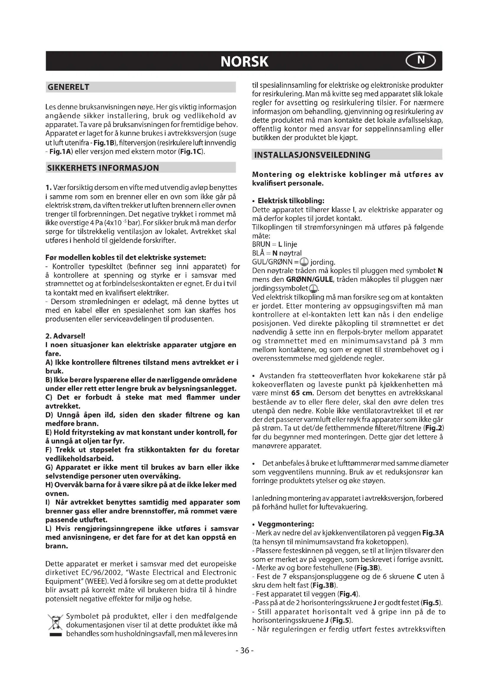 brenner gass eller andre brennstoer, må rommet være passende utluftet. L) Hvis rengjøringsinngrepene ikke utføres i samsvar med anvisningene, er det fare for at det kan oppstå en brann. Dette apparatet er merket i samsvar med det europeiske dirketivet EC/96/2002, “Waste Electrical and Electronic Equipment” (WEEE). Ved å forsikre seg om at dette produktet blir avsatt på korrekt måte vil brukeren bidra til å hindre potensielt negative eekter for miljø og helse. Symbolet på produktet, eller i den medfølgende dokumentasjonen viser til at dette produktet ikke må behandles som husholdningsavfall, men må leveres inn til spesialinnsamling for elektriske og elektroniske produkter for resirkulering. Man må kvitte seg med apparatet slik lokale regler for avsetting og resirkulering tilsier. For nærmere informasjon om behandling, gjenvinning og resirkulering av dette produktet må man kontakte det lokale avfallsselskap, offentlig kontor med ansvar for søppelinnsamling eller butikken der produktet ble kjøpt. INSTALLASJONSVEILEDNING Montering og elektriske koblinger må utføres av kvalisert personale.