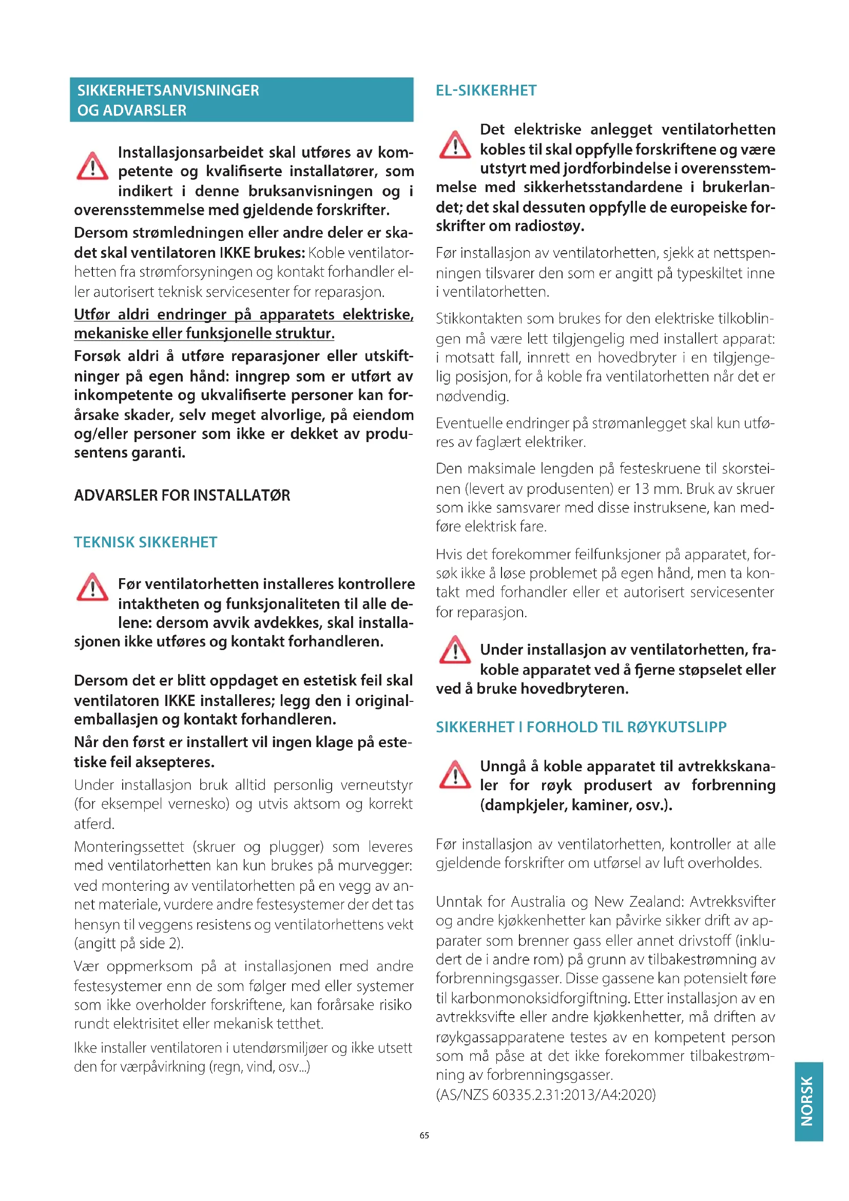 Unngå å koble apparatet til avtrekkskana- ler for røyk produsert av forbrenning (dampkjeler, kaminer, osv.). Før installasjon av ventilatorhetten, kontroller at alle gjeldende forskrifter om utførsel av luft overholdes. Unntak for Australia og New Zealand: Avtrekksvifter og andre kjøkkenhetter kan påvirke sikker drift av ap- parater som brenner gass eller annet drivsto (inklu- dert de i andre rom) på grunn av tilbakestrømning av forbrenningsgasser. Disse gassene kan potensielt føre til karbonmonoksidforgiftning. Etter installasjon av en avtrekksvifte eller andre kjøkkenhetter, må driften av røykgassapparatene testes av en kompetent person som må påse at det ikke forekommer tilbakestrøm- ning av forbrenningsgasser.