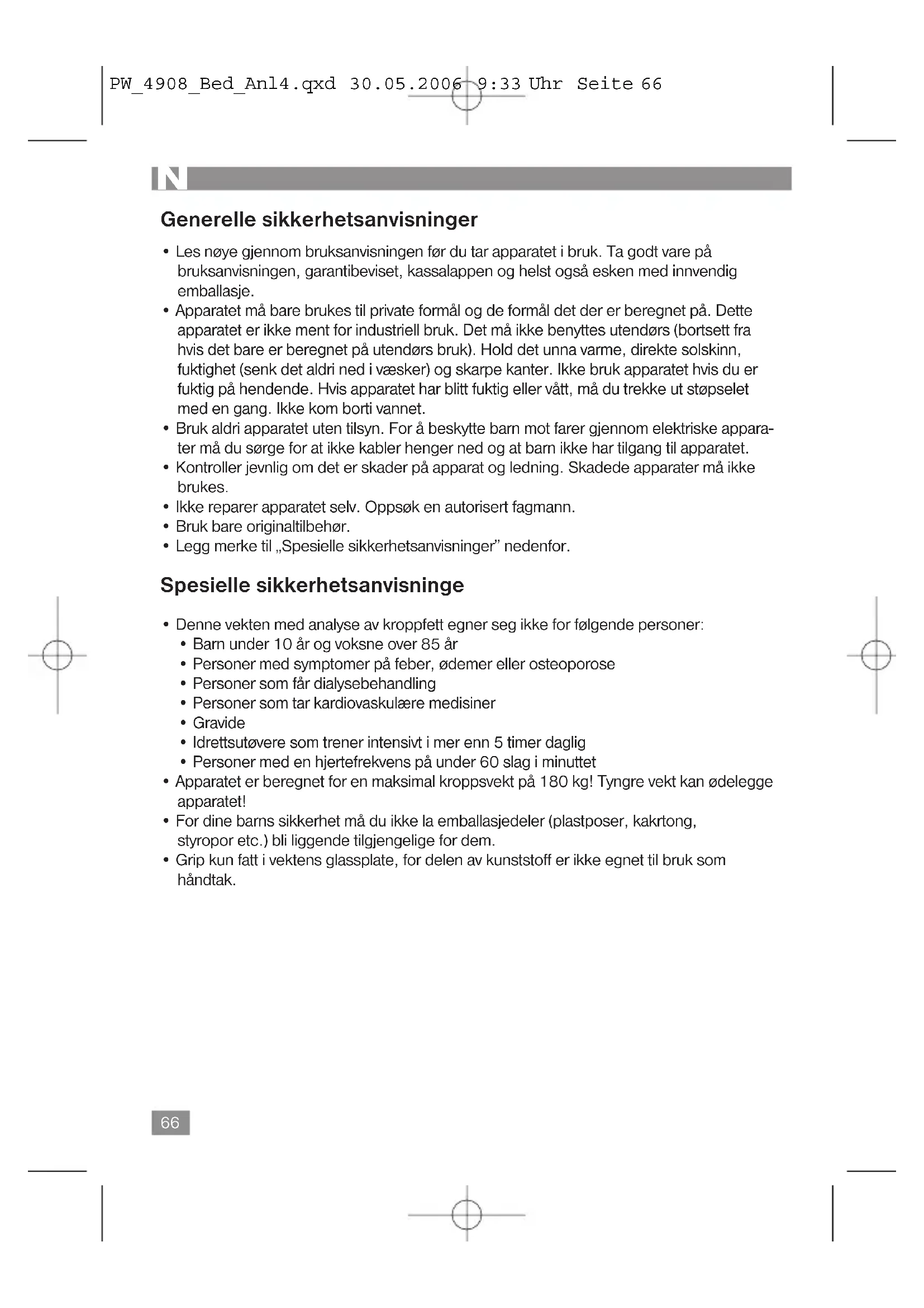 PW_4908_Bed_Anl4.qxd 30.05.2006 9:33 Uhr Seite 67Informasjon om måling av kroppsfett Personer som bruker en hjertestimulator eller et annet medisinisk implantat med elektronis- ke komponenter, frarådes fra å bruke denne vekten. Den kan påvirke eller sette implanta- tets funksjoner i fare. Apparatet fungerer bare riktig når du står barbeint med tørre føtter på kontaktfl atene! Det grunnleggende prinsippet for apparatet går ut på å måle kroppens elektriske impe- dans. Apparatet sender et svakt, umerkelig elektrisk signal gjennom kroppen din og fi nner deretter de aktuelle verdiene for deg. Signalet er normalt helt ufarlig! Se likevel våre spesielle sikkerhetsinstrukser! Denne formen for måling er kjent under begrepet ”bioelektrisk impedansanalyse” (BIA), en faktor som henger sammen med både fett- og vannandelen i kroppen samt med andre bio- logiske data (alder, kjønn, kroppshøyde). Det finnes tunge mennesker som har et balansert forhold mellom fett- og muskelmasse, og det fi nnes tilsynelatende slanke mennesker med klart forhøyede kroppsfettverdier. Fett er en faktor som bidrar sterkt til å belaste organismen, særlig hjerte-kar-systemet. Derfor er det en grunnleggende forutsetning for helse og sunnhet å kontrollere begge verdiene (både fett og vekt). Kroppsfett Kroppsfett er en viktig del av organismen. Fett har en viktig oppgave i kroppen, fra å bes- kytte leddene og lagre vitaminer til å regulere kroppstemperaturen. Målet er altså ikke å redusere fettandelen radikalt, men å oppnå og opprettholde et balansert forhold mellom muskelmasse og fettmasse. Hva vann betyr for helsen vår Den menneskelige organismen består av ca. 55–60 % vann, noe avhengig av alder og kjønn. Vann har en rekke oppgaver i kroppen: Det er byggestein i cellene våre. Det betyr at alle cellene i kroppen, både hud-, kjertel-, muskel-, hjerneceller og andre celler, bare kan fungere hvis de inneholder tilstrekkelig med vann. Det er oppløsningsmiddel for viktige substanser i organismen. Det er transportmiddel for næringsstoffer, kroppens egne substanser og stoffskifteproduk- ter. Retningsgivende verdier for din helseprofi l fi nner du i referansetabellen. Den viser kropps- fettverdienes avhengighetsforhold til alder og kjønn. Legg merke til at både vannreservene i kroppen og fettandelen svinger kraftig i løpet av dagen. Mål derfor alltid på samme tids- punkt på dagen for å få en sammenlignbar verdi. Måleresultatene for andelen kroppsfett og andelen kroppsvann er kun referanseverdier. De anbefales ikke brukt til medisinske formål. Rådfør deg alltid med legen din dersom du har spørsmål om en medisinsk behandling eller en diett for å oppnå normalvekt.